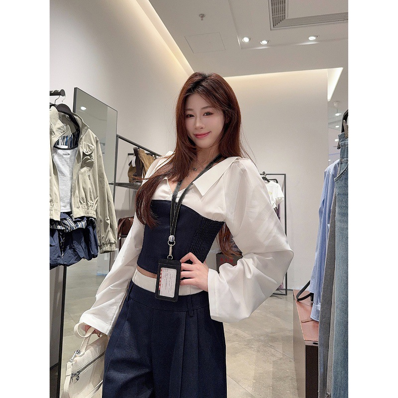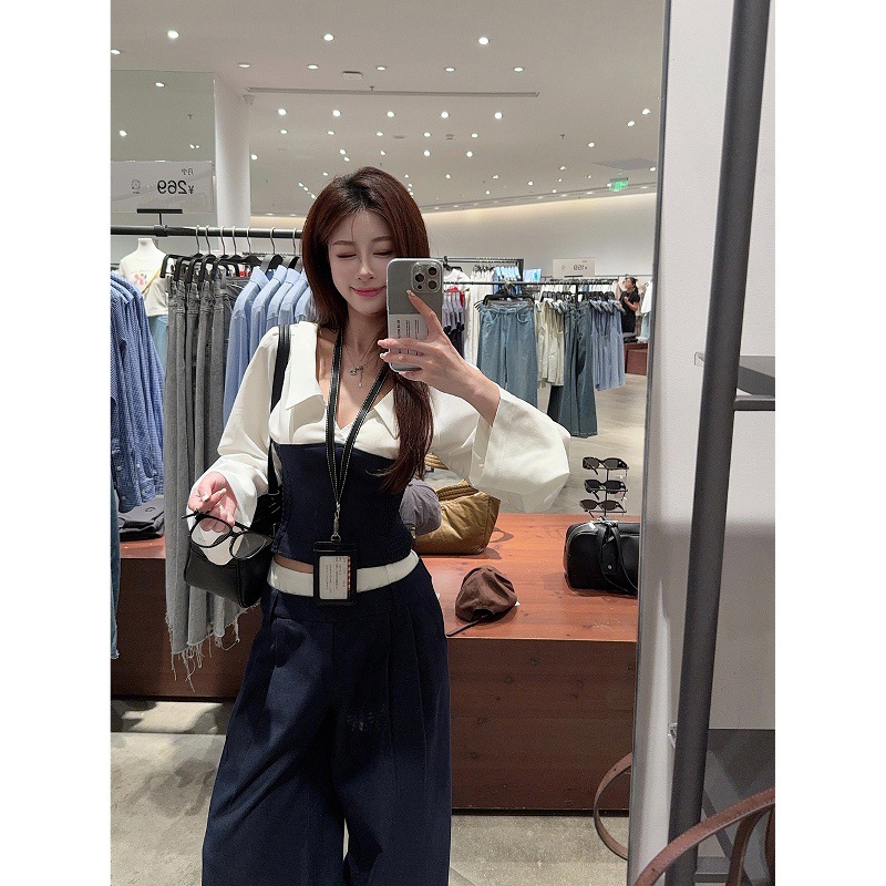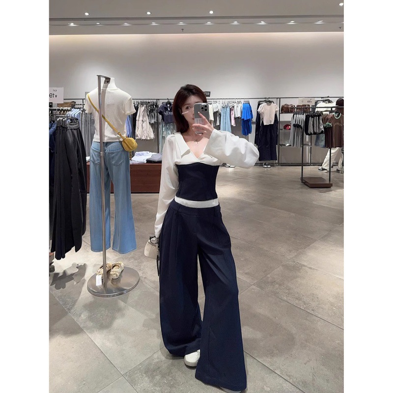 2025新款慵懒风拼接撞色翻领长袖衬衫女秋季百搭宽松休闲裤两件套