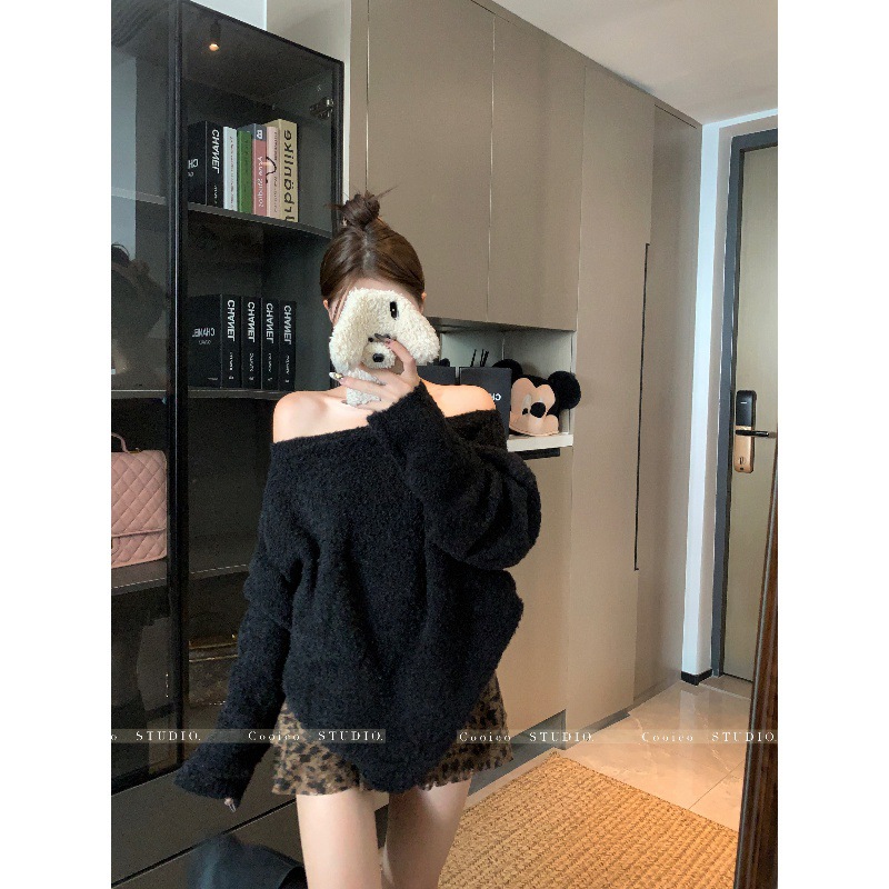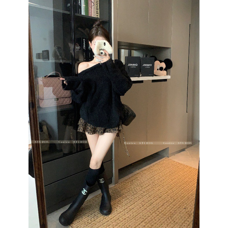 2025新款时尚套装黑色一字领针织毛衣女秋季豹纹高腰半身裙两件套