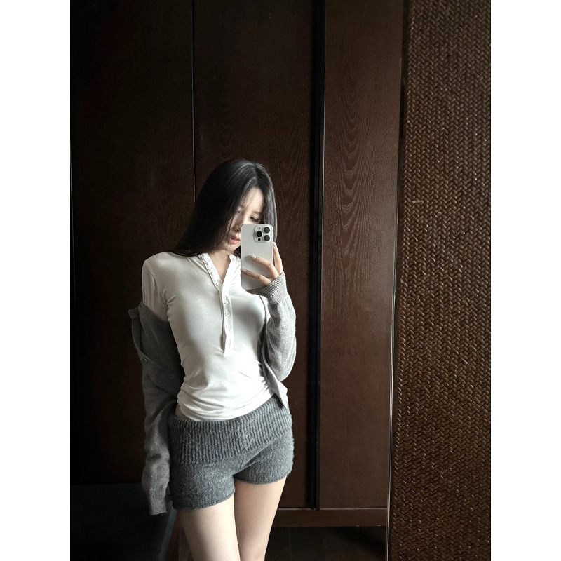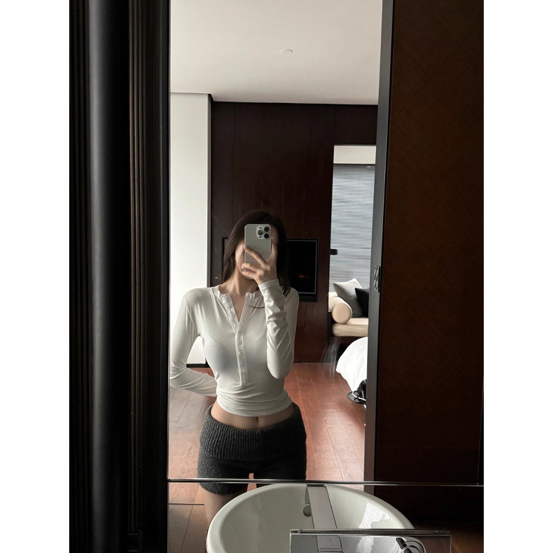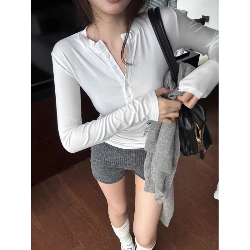 2025新款设计感白色半开领纽扣长袖T恤女装秋季别致减龄显瘦上衣