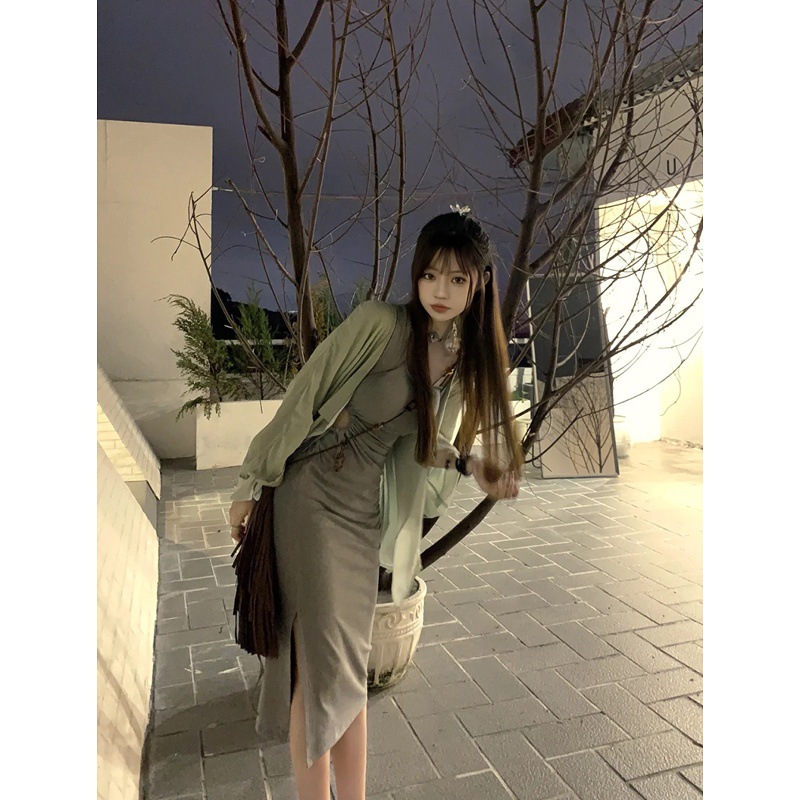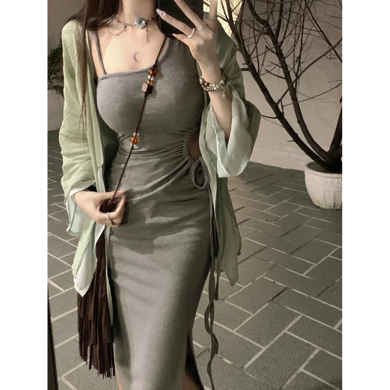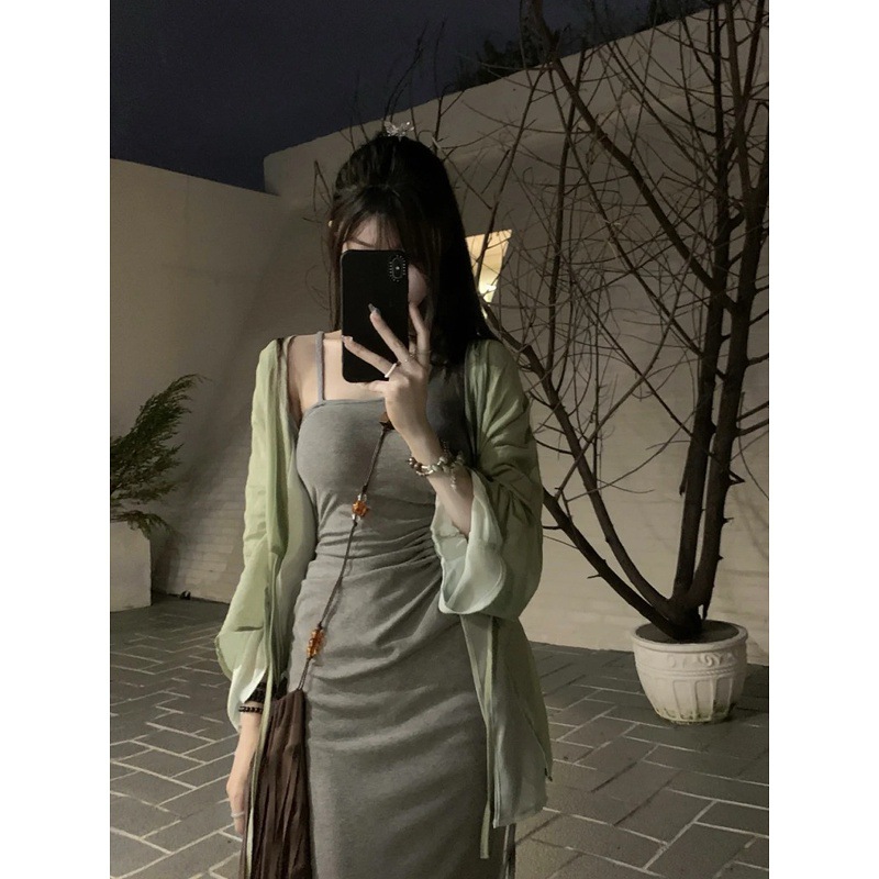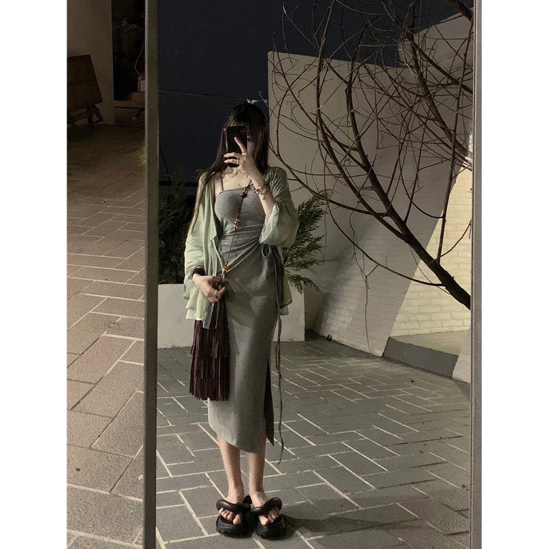 2025新款慵懒风薄款开衫长袖外套女秋季内搭显瘦吊带连衣裙两件套