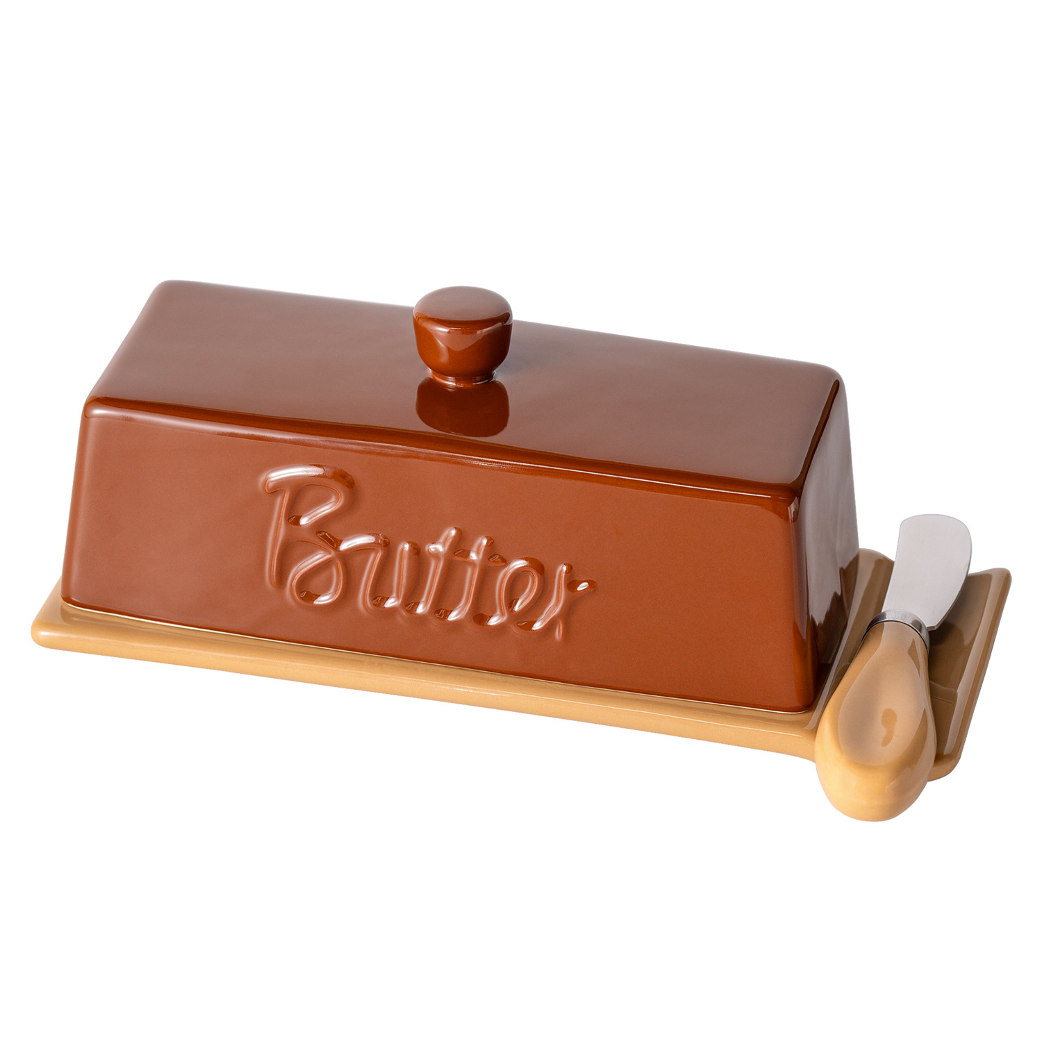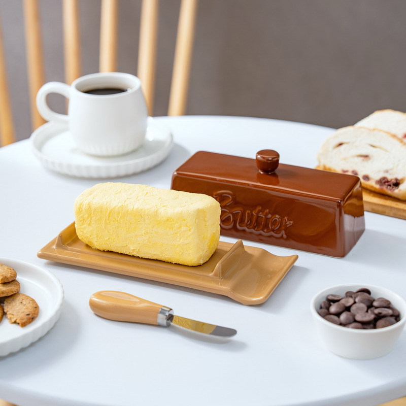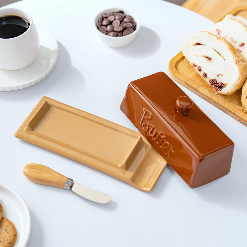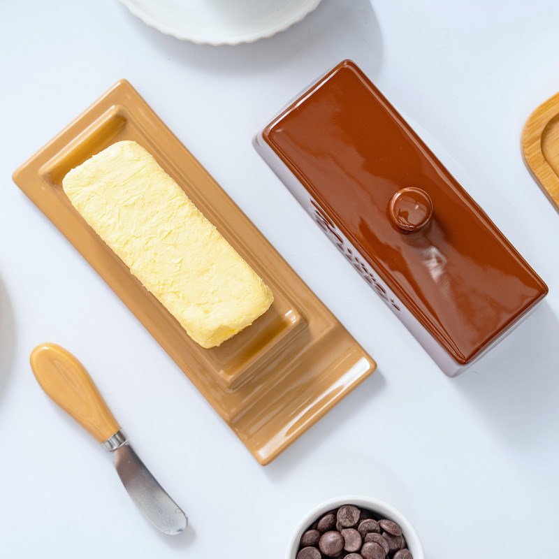 跨境原创新品美拉德牛油碟陶瓷黄油盒 奶酪储藏餐厅家用带盖配刀