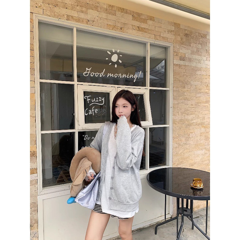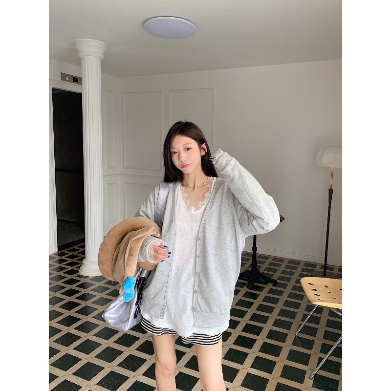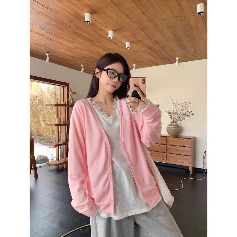 2025新款慵懒风宽松纯色开衫外套女秋季内搭蕾丝边长袖T恤两件套