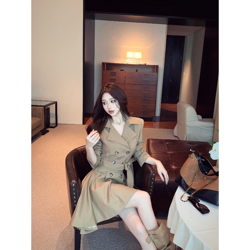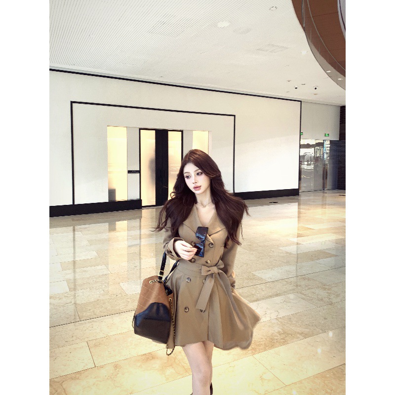2025新款时尚套装翻领系带风衣外套女秋季高腰半身裙A字裙两件套