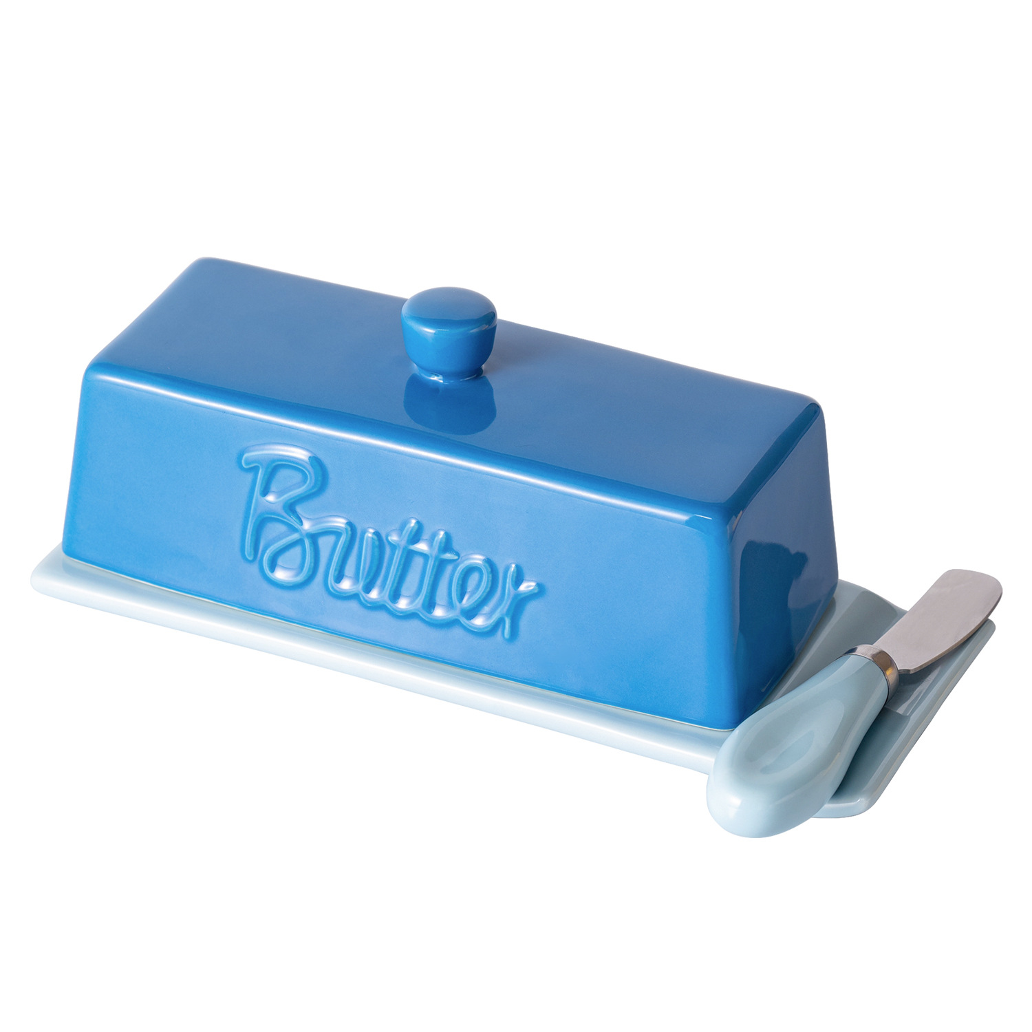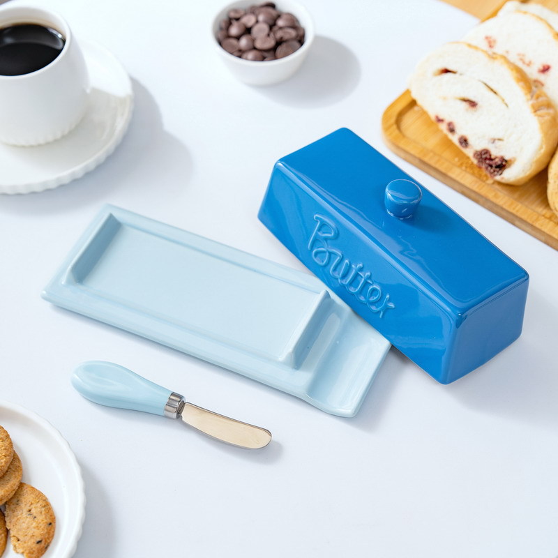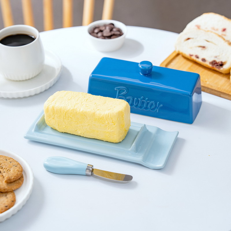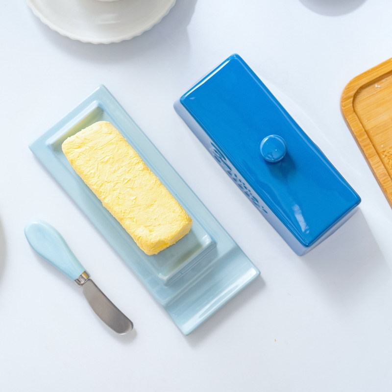 跨境原创蓝色色釉双色黄油盒陶瓷黄油碟 餐厅家用配刀奶酪牛油盒