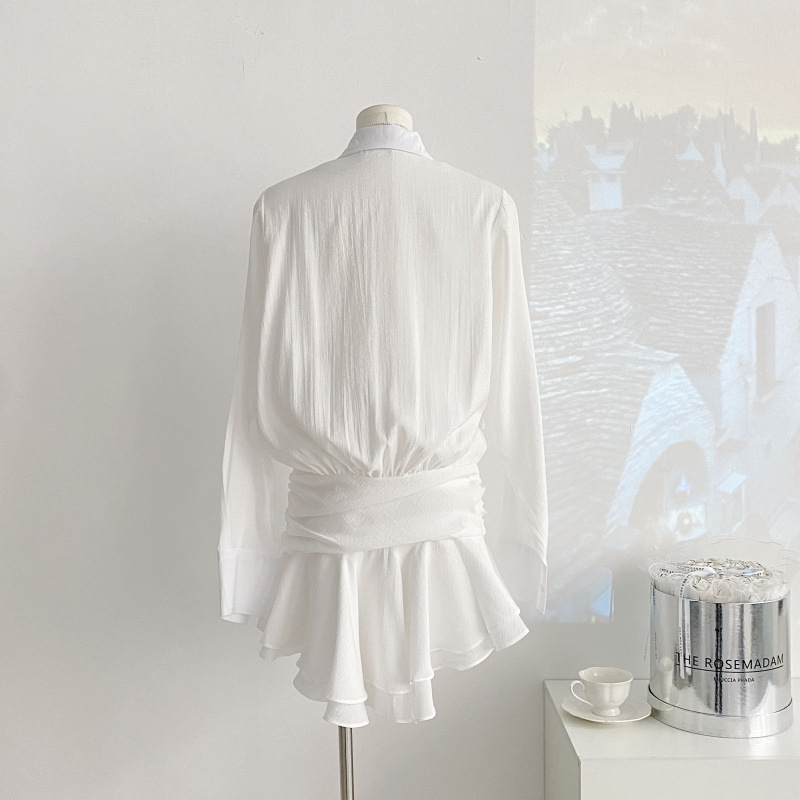跨境定制春秋新款剪刀领不规则裙子腰封假两件气质长袖衬衣连衣裙