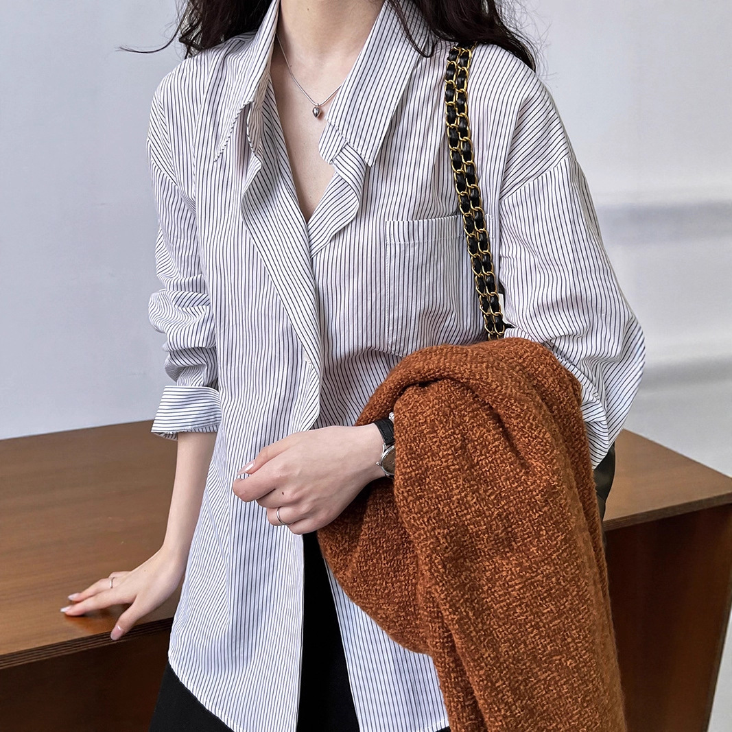 鹿西港风气质条纹衬衫女春季慵懒宽松盐系外穿落肩袖衬衣外套3101