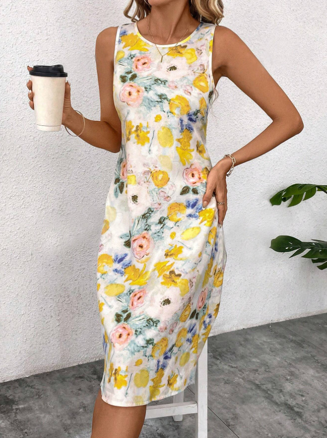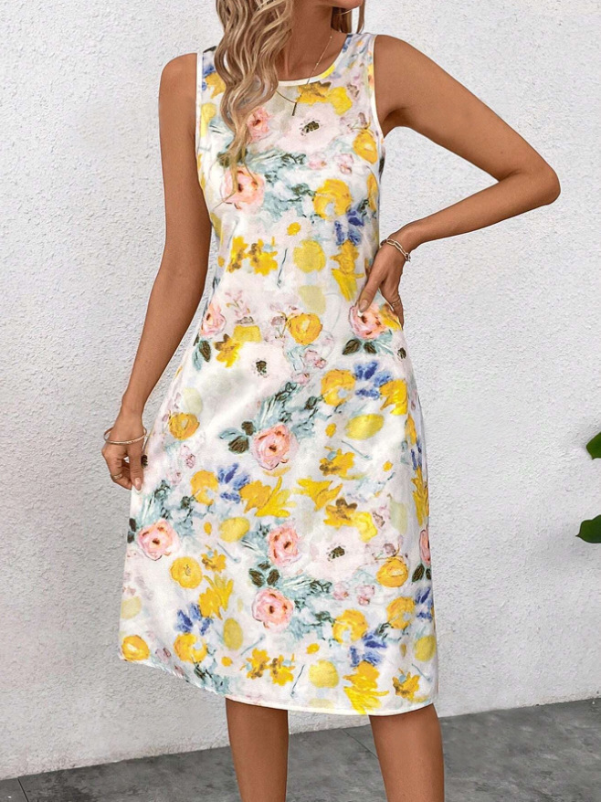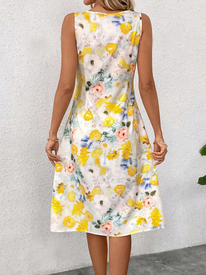 2025欧美跨境新款夏季连衣裙花朵印花无袖圆领宽松连衣裙