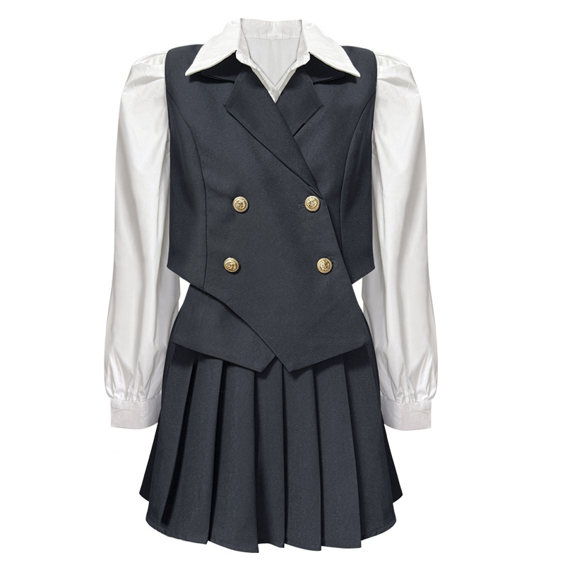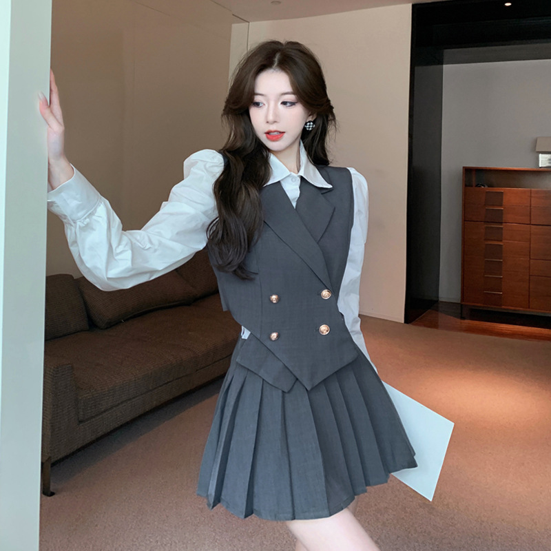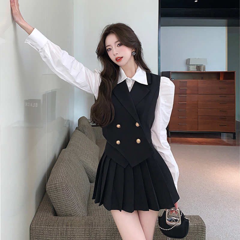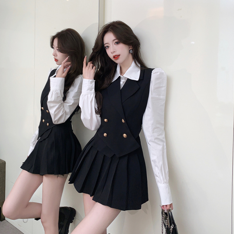 韩版现货 港味网红气质双排扣西装马甲高腰百褶裙衬衫三件套套装