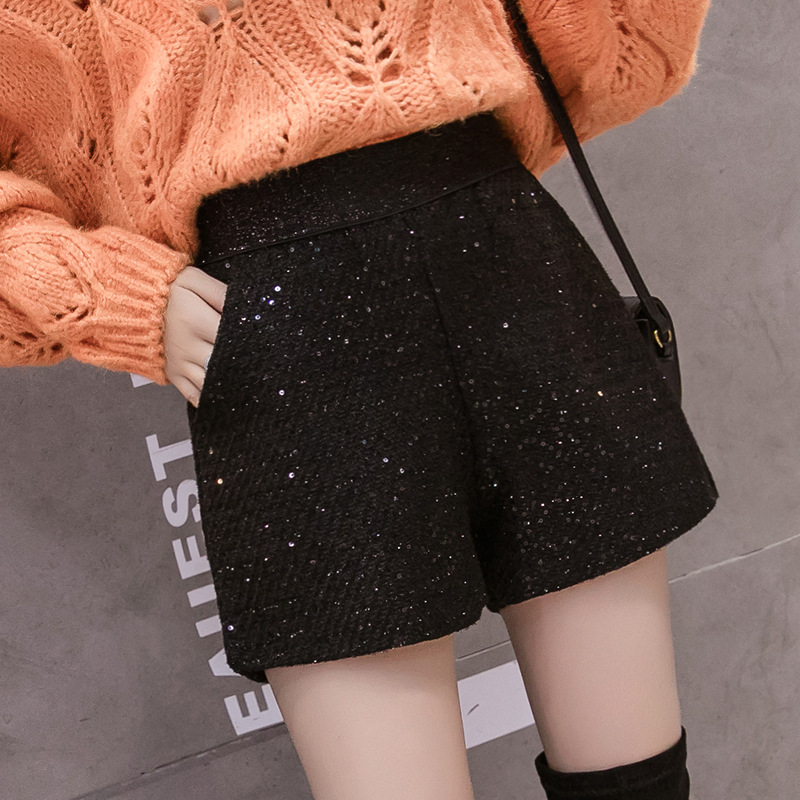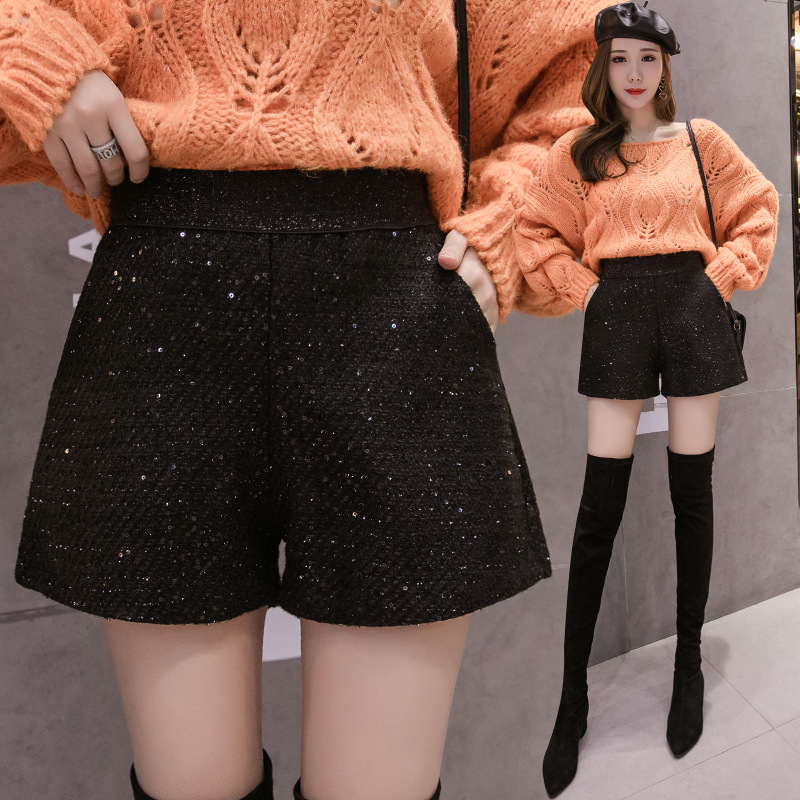 韩版 2025年秋冬百搭松紧腰闪闪粗麻呢亮丝毛呢阔腿靴裤外穿短裤