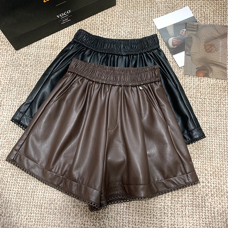 韩版 2025秋冬宽松显瘦松紧腰镂空花边设计洗水软皮休闲阔腿短裤