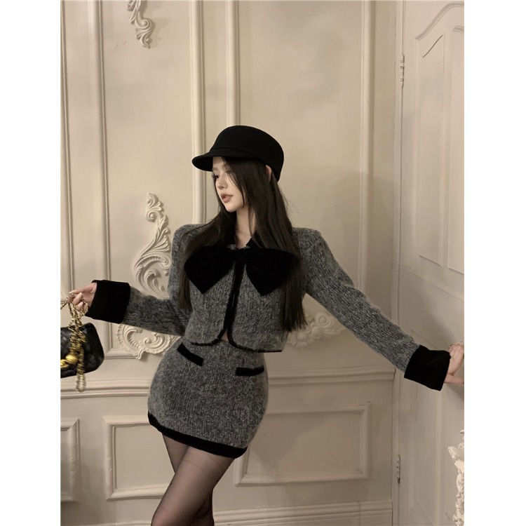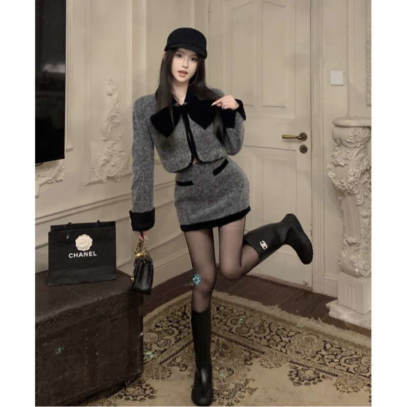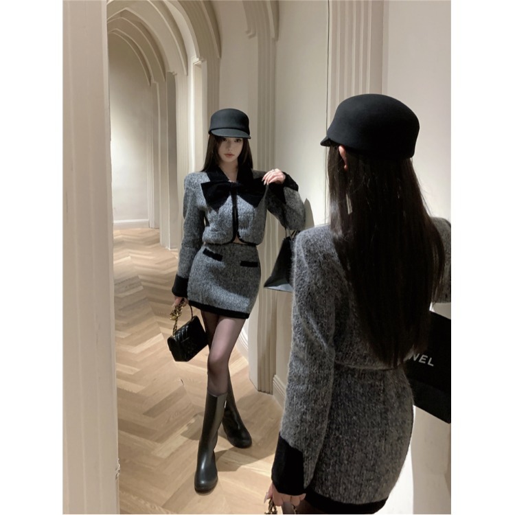 2025新款气质套装撞色蝴蝶结毛呢外套女秋季高腰包臀半身裙两件套