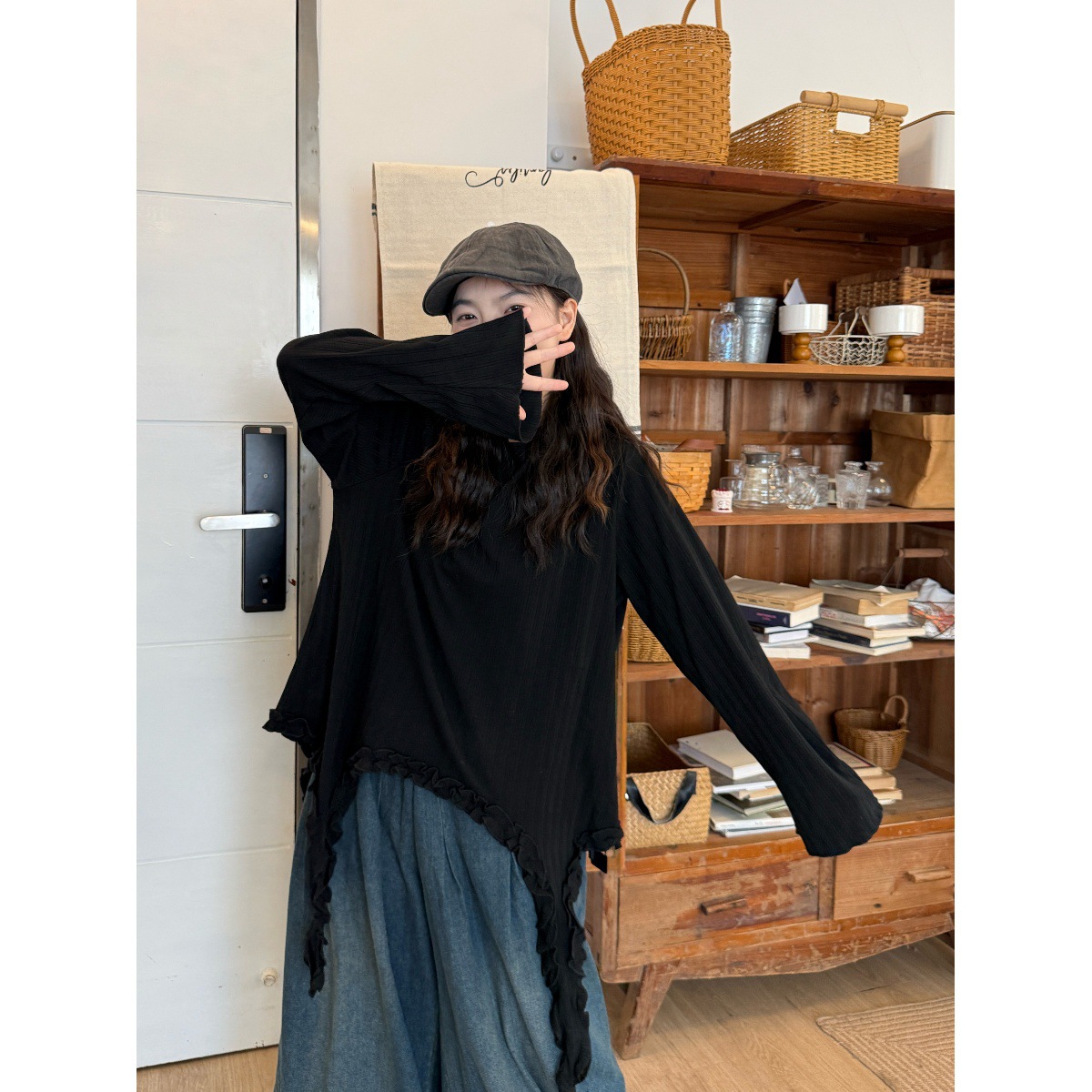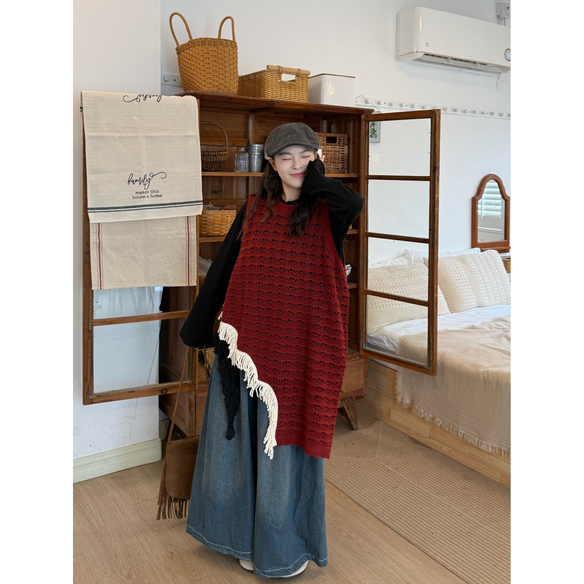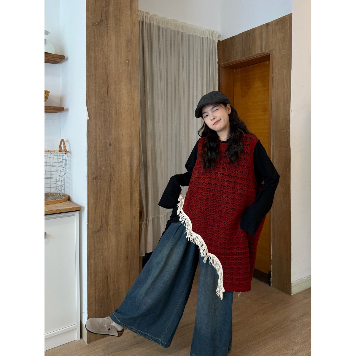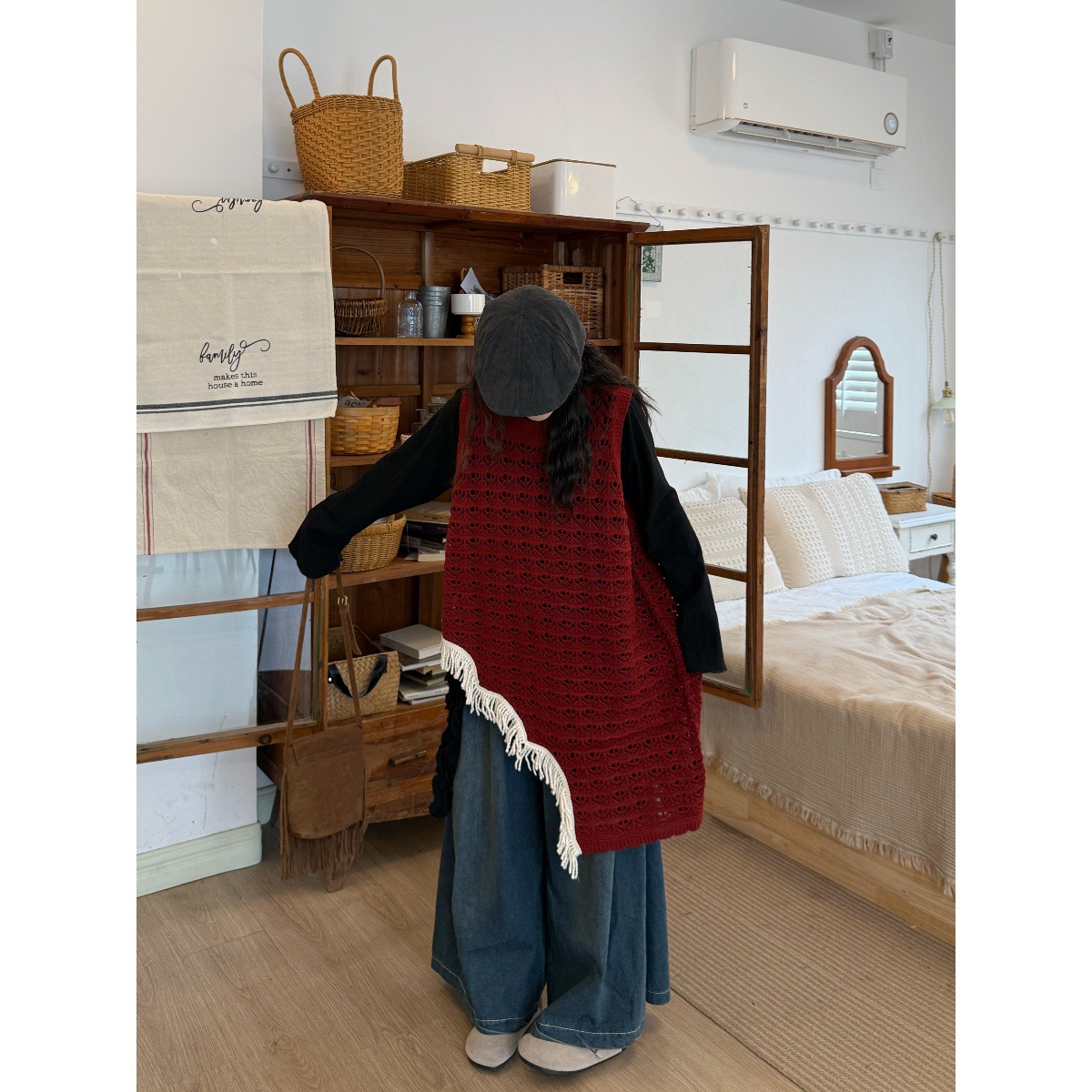 2025新款慵懒风黑色长袖T恤女叠穿针织马甲秋季宽松牛仔裤三件套
