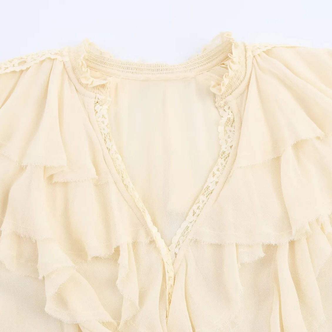 ZA外贸批发欧美风2025秋季新款温柔气质叠层装饰蕾丝长袖衬衫上衣
