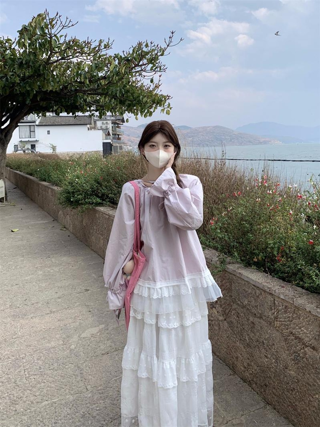 韩系喇叭长袖衬衫女2025新款秋装抽绳蕾丝下边拼接圆领宽松上衣潮