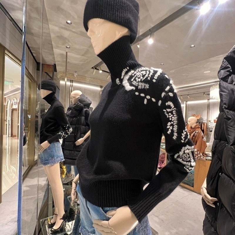 2025秋冬新款女式小众设计感玫瑰刺绣黑色打底女装毛衣