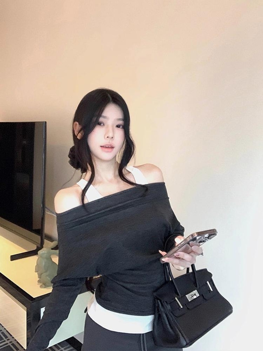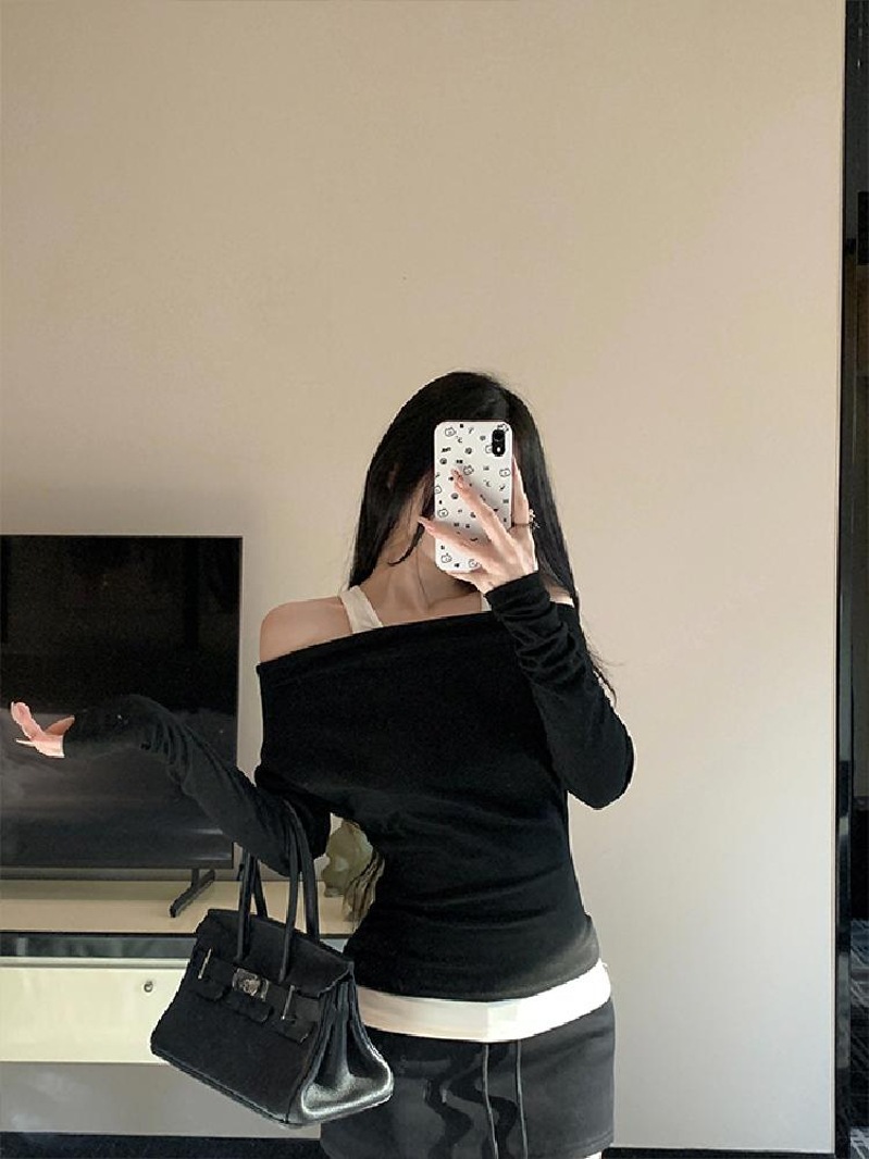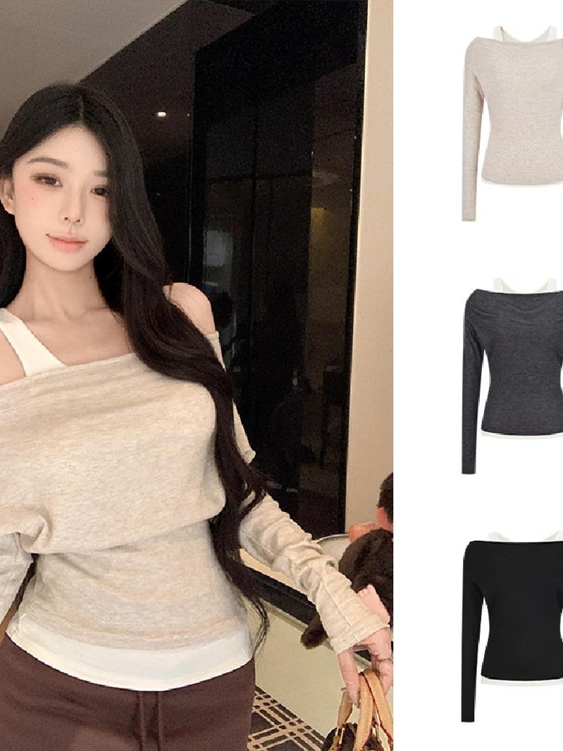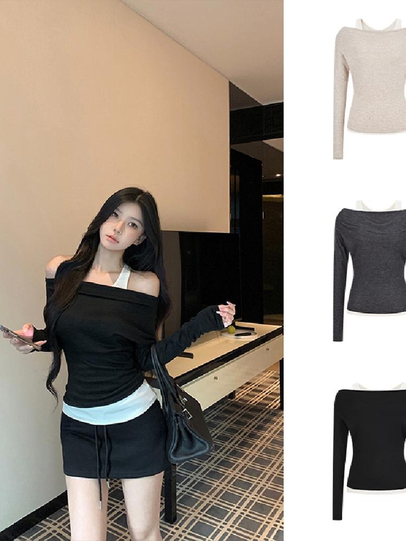 2025新款秋装纯欲风时尚气质百搭假两件挂脖露肩长袖t恤上衣女ins