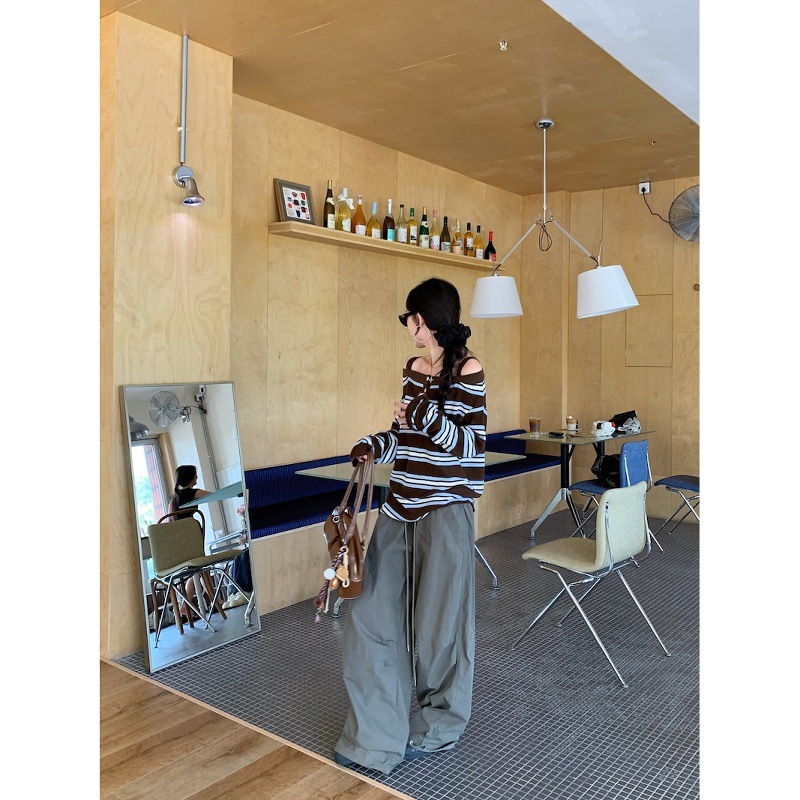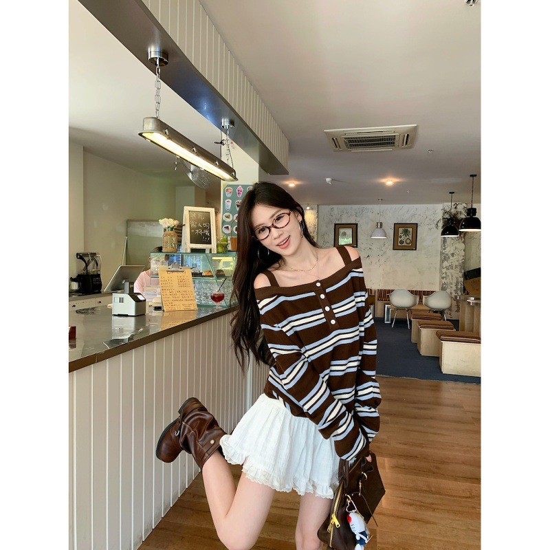 2025新款复古条纹一字领长袖针织衫女装秋季小众别致宽松露肩上衣