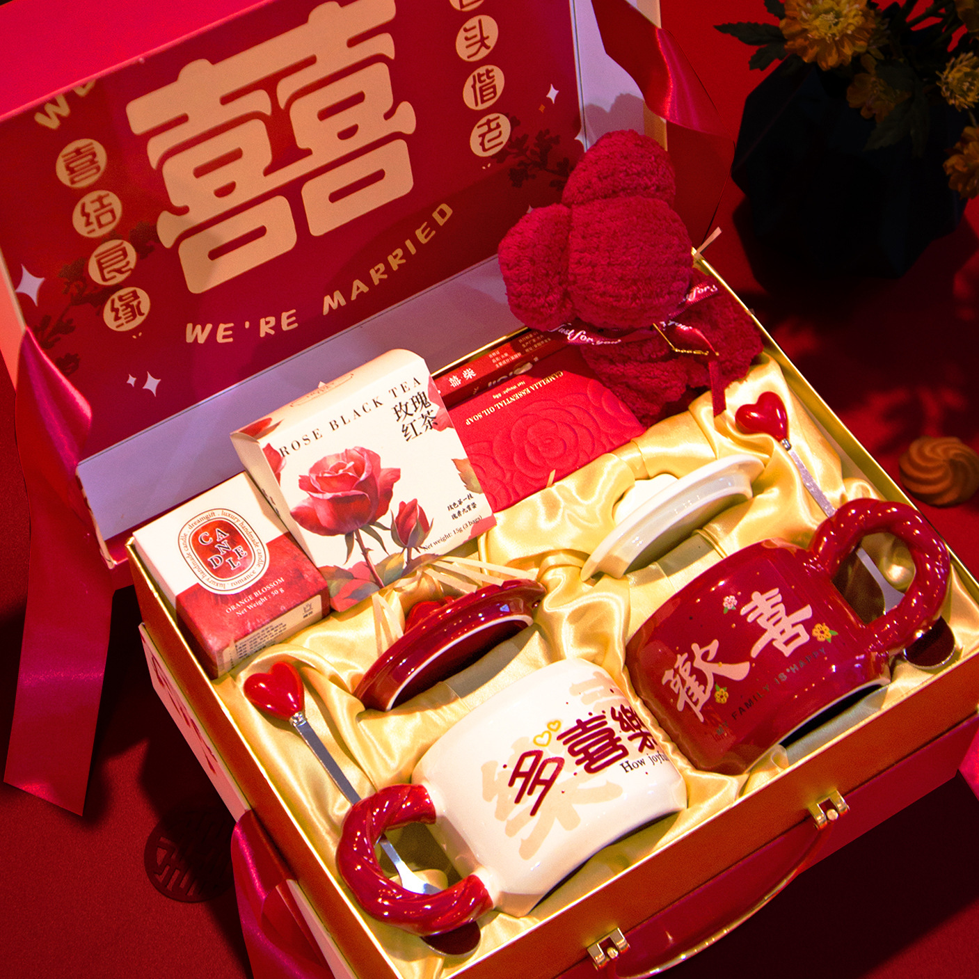 囍乐对杯+小熊毛巾+玫瑰金茶+香薰蜡烛+囍皂【伴手礼盒】
