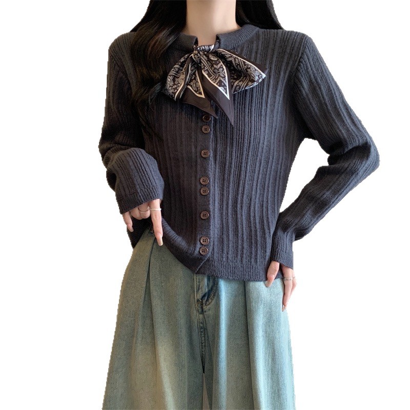 2025新款秋季宽松显瘦百搭衬衣配丝巾毛衣韩版长袖针织衫上衣女