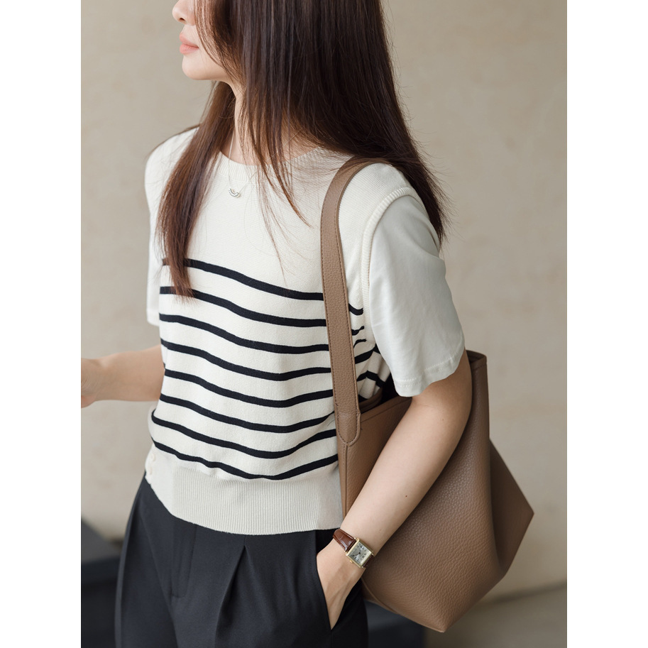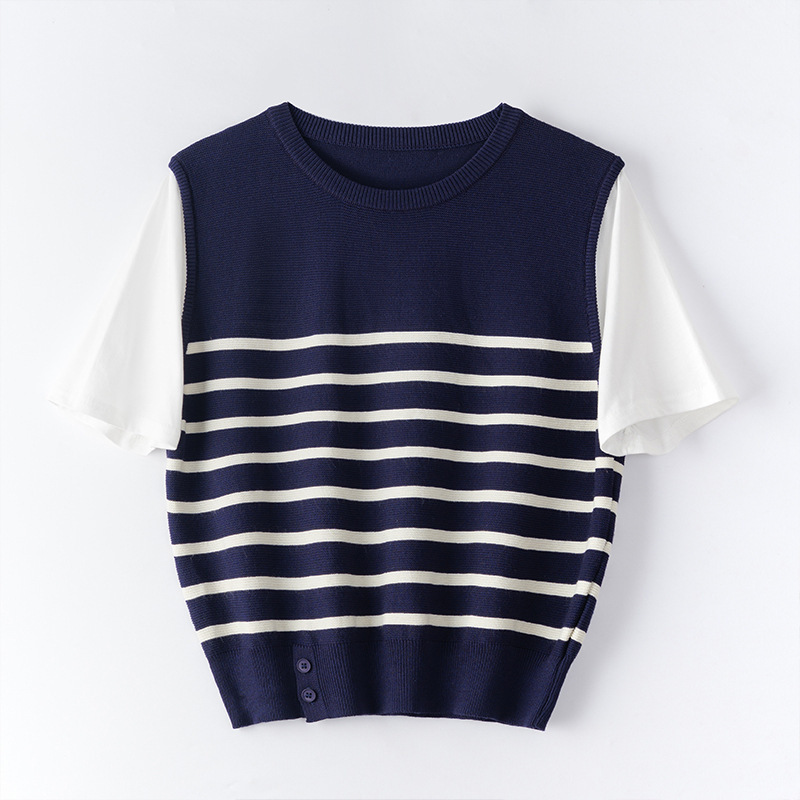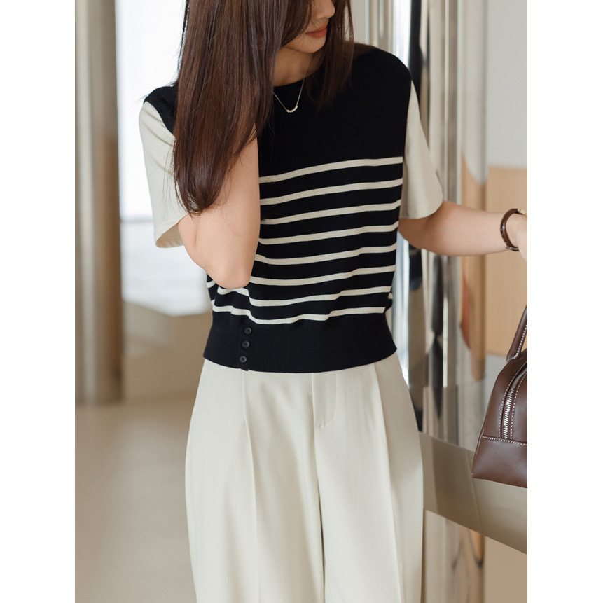 假两件冰丝针织衫圆领针织短袖女2025早秋新款条纹撞色气质上衣