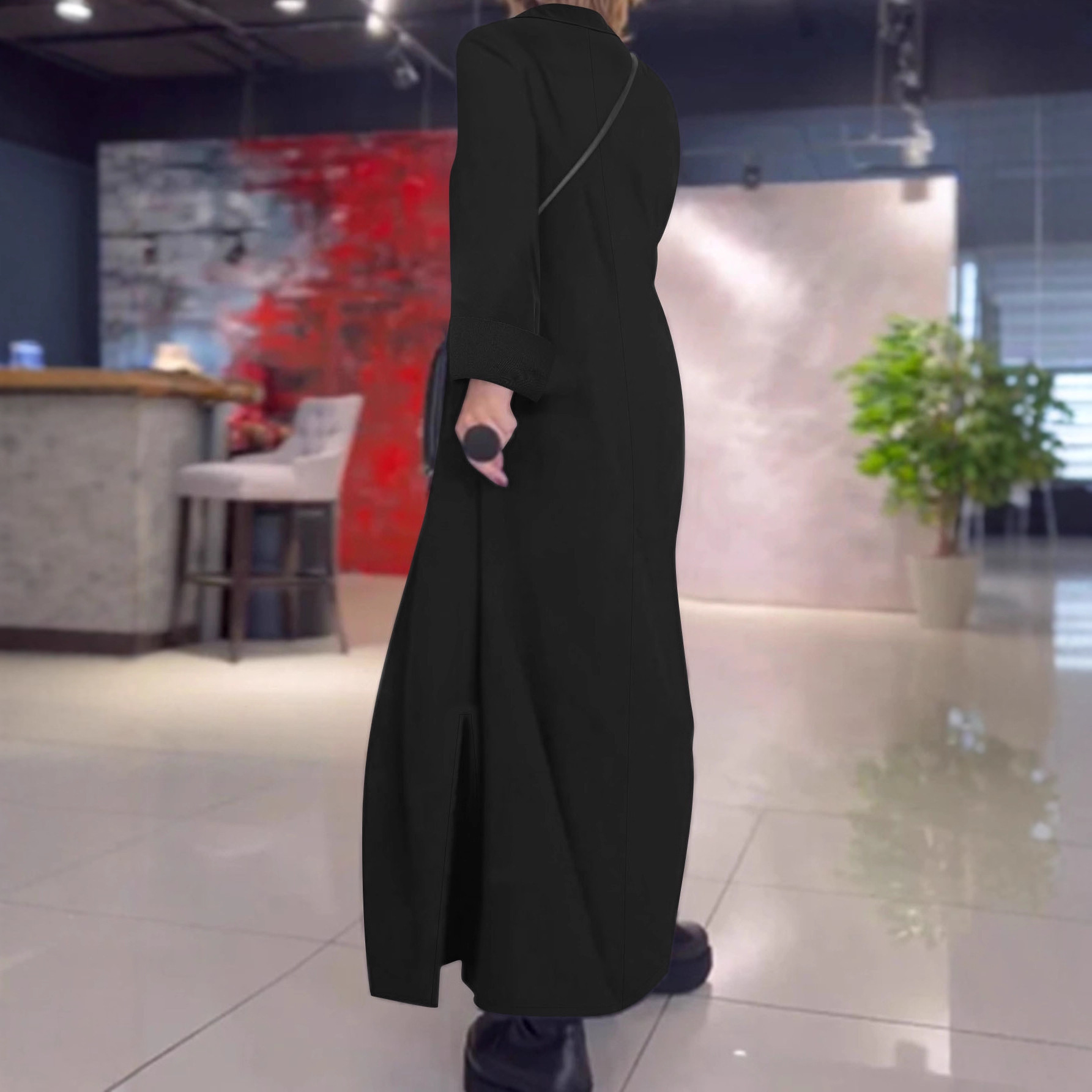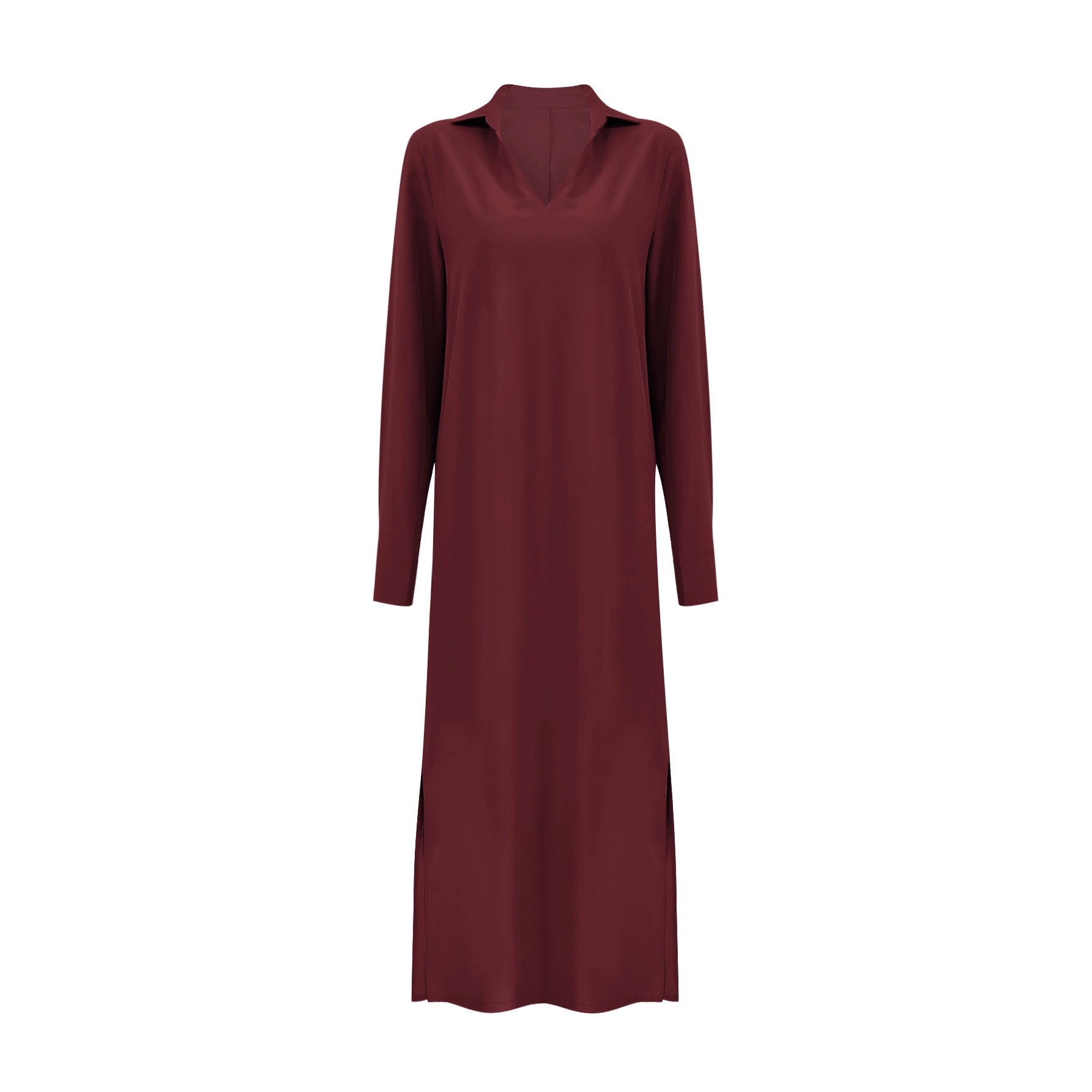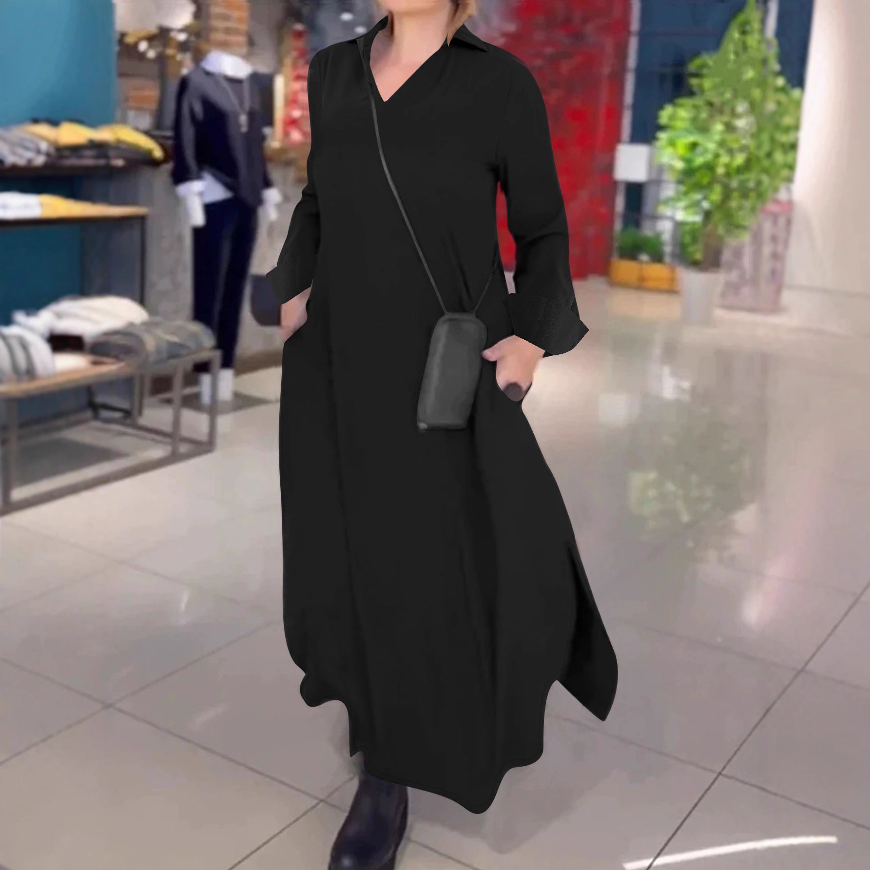 欧美跨境外贸简约优雅纯色连衣裙秋冬POLO领深V长袖连衣长裙女装