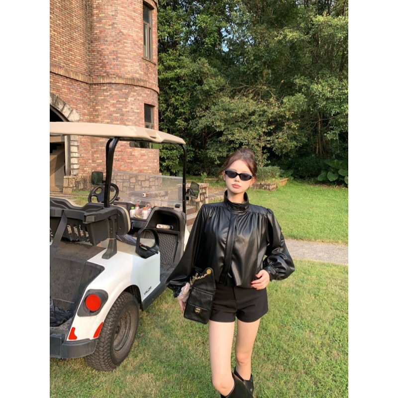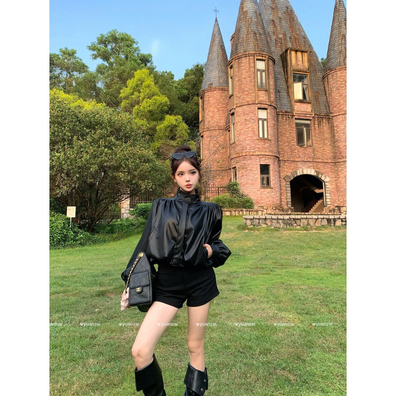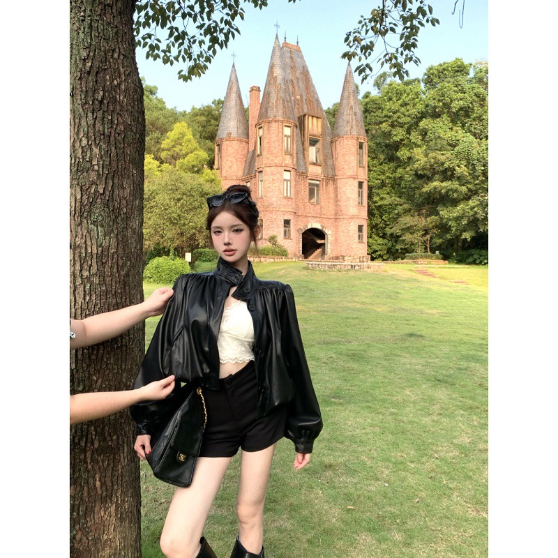 2025新款辣妹套装气质立领皮衣外套女秋季高腰显瘦黑色短裤两件套