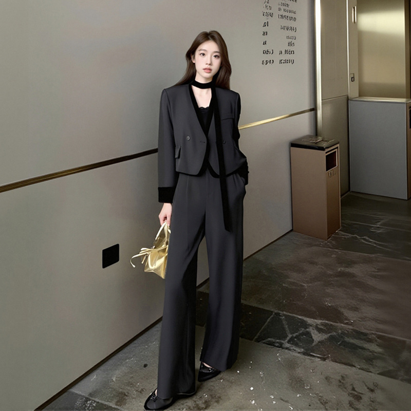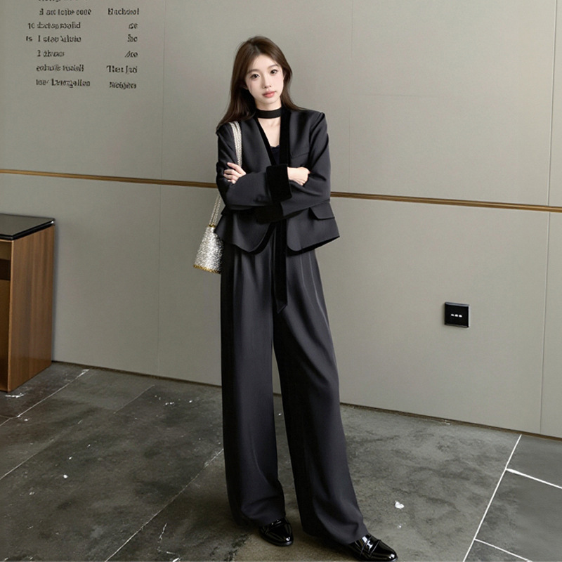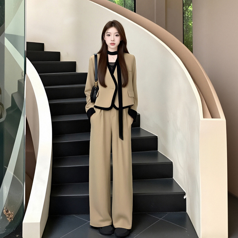 韩版 假两件撞色拼接V领西装短外套套装女2025时尚阔腿裤两件套秋