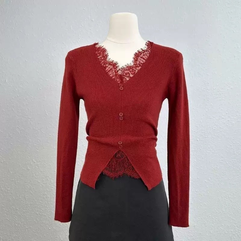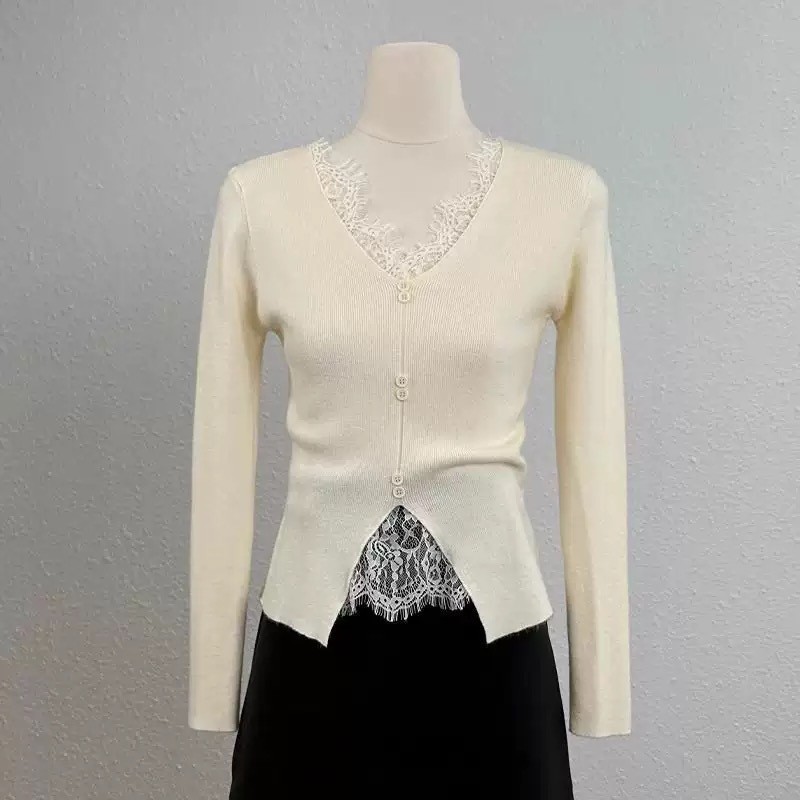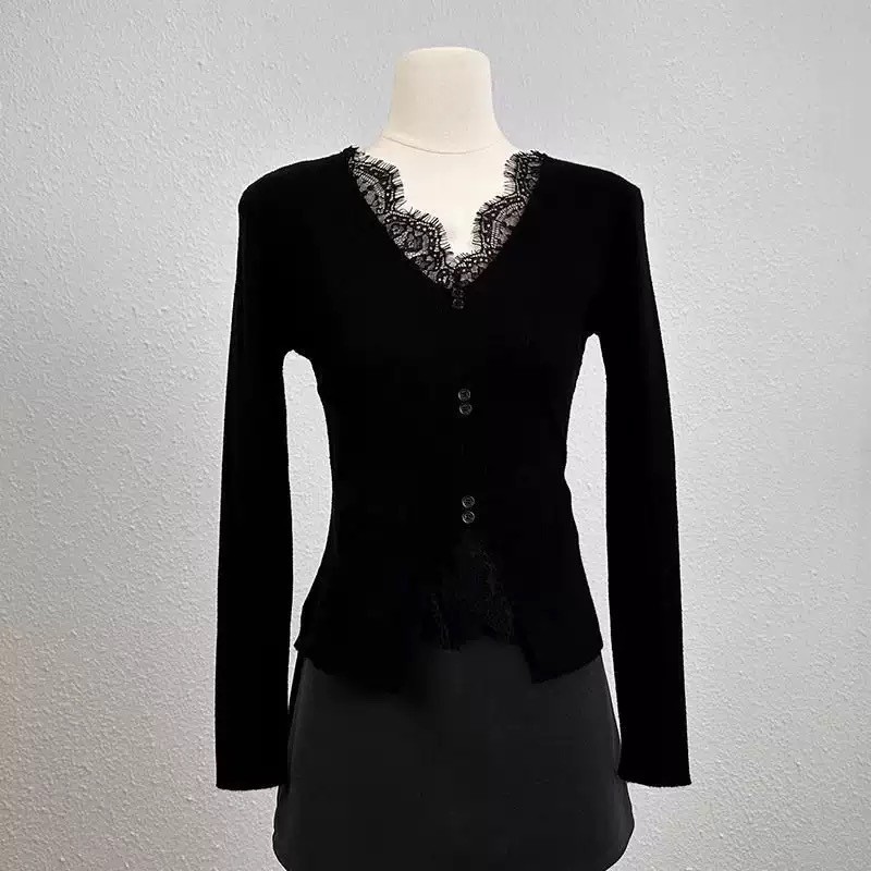 秋冬新款温柔风修身别致打底衫性感蕾丝拼接V领长袖针织衫女上衣