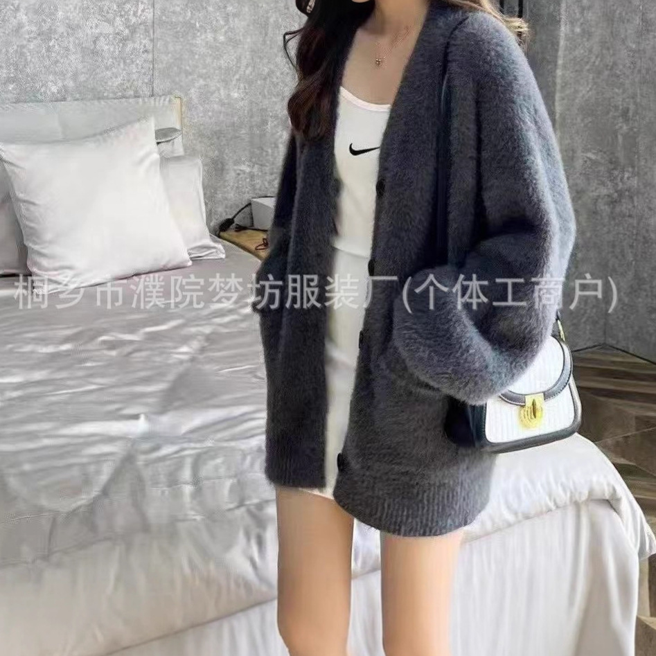 25秋冬新款仿水貂绒V领慵懒风高级感女式针织开衫口袋款毛衣外套