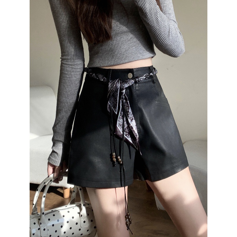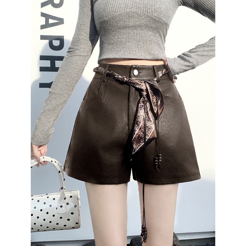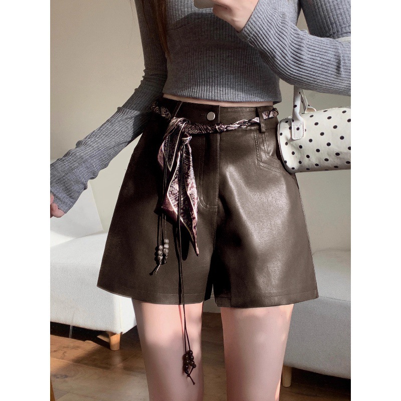 2025新款美拉德咖啡色PU皮高腰休闲裤女装秋季百搭宽松直筒裤短裤