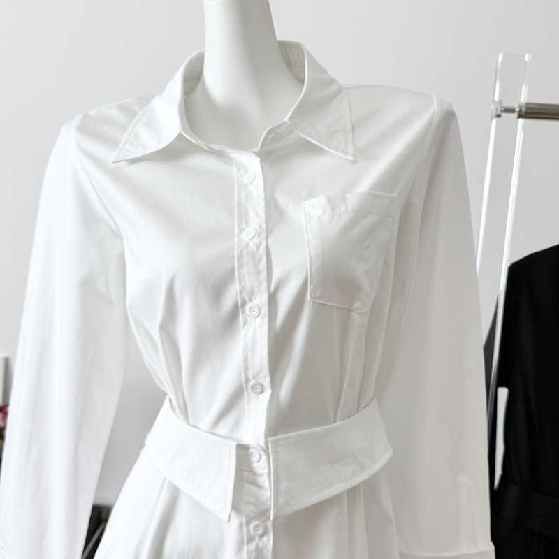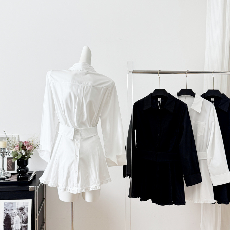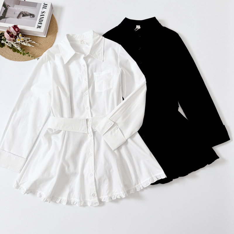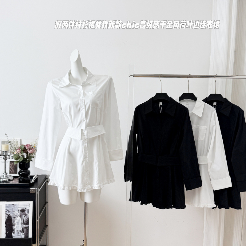 假两件黑色衬衫裙女秋季2025高级感荷叶边收腰显瘦连衣裙