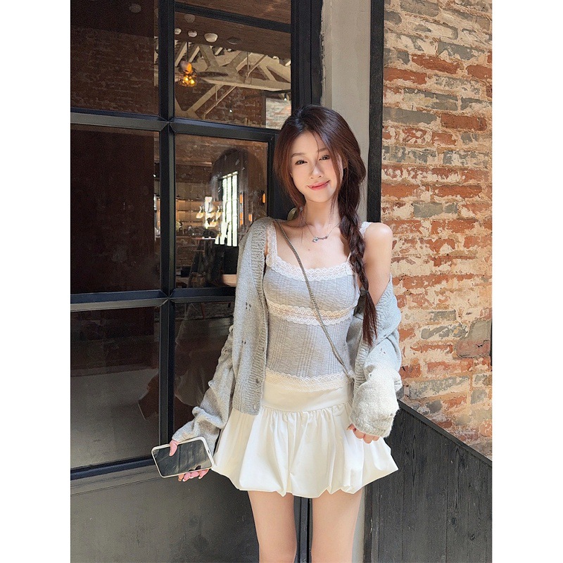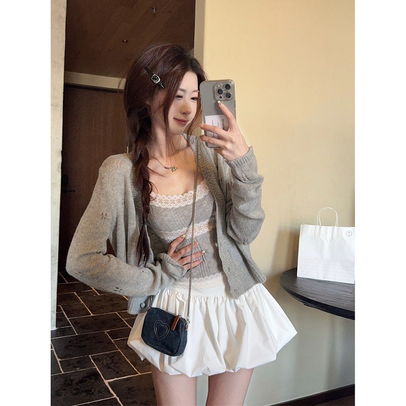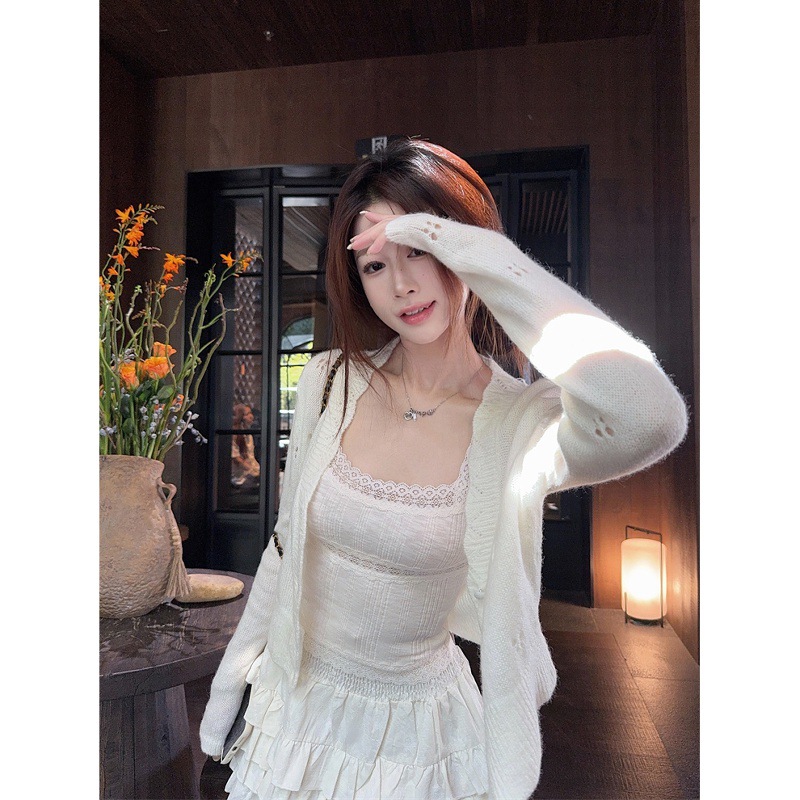 2025新款甜美套装镂空长袖针织开衫女秋季内搭花边吊带背心两件套