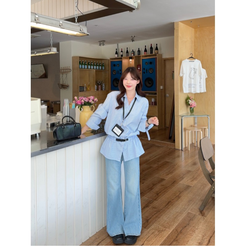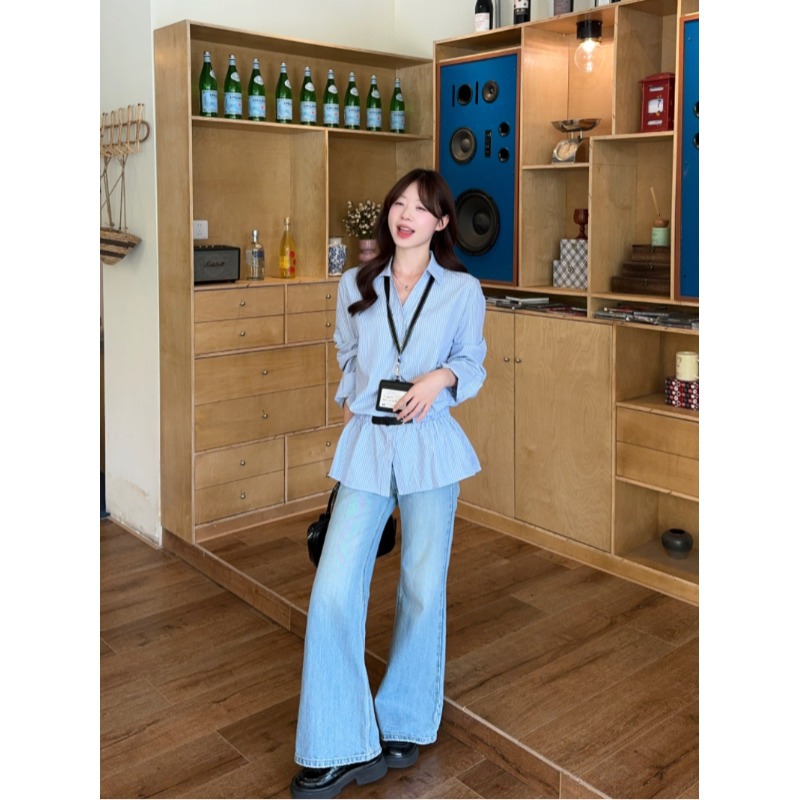 2025新款设计感蓝色条纹翻领气质长袖衬衫女秋季收腰显瘦百搭上衣