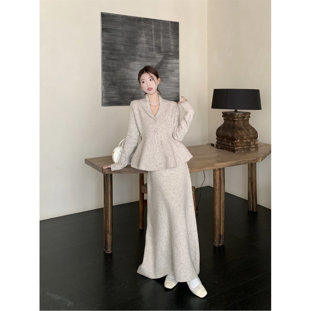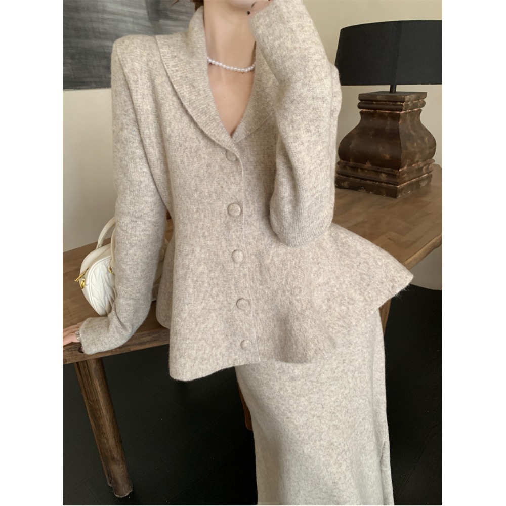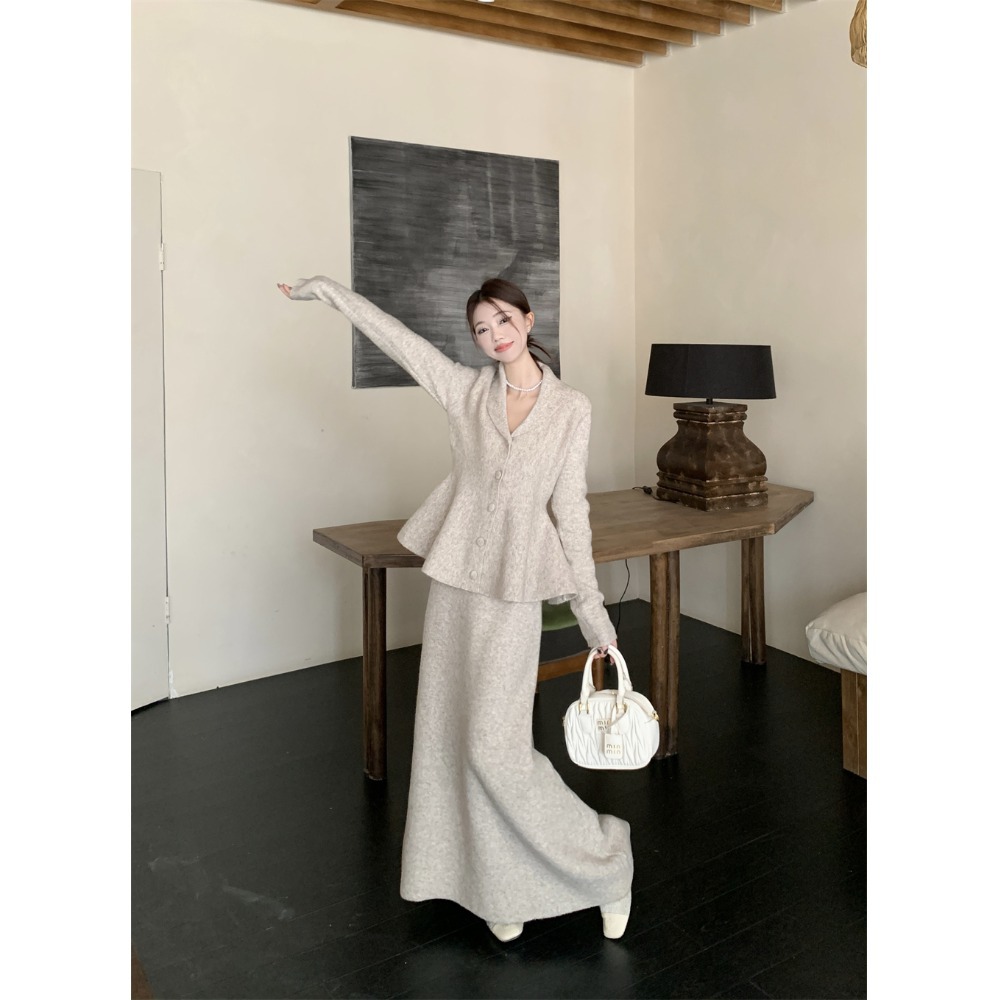 2025新款温柔套装收腰燕麦色毛衣外套女秋季高腰垂感半身裙两件套
