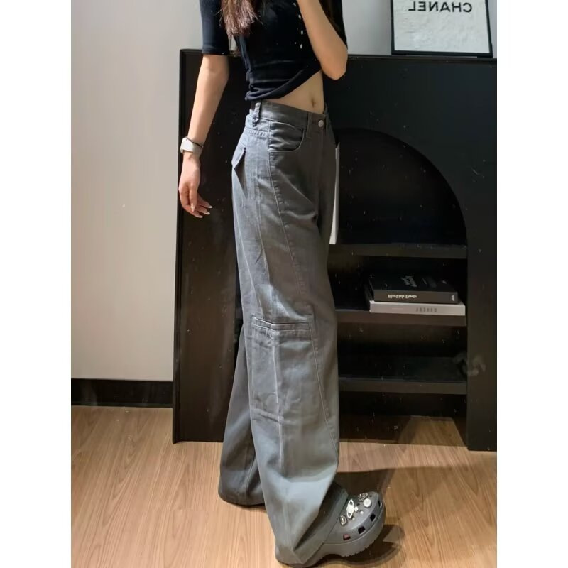 复古灰色阔腿工装牛仔裤女2025春秋季大码高腰宽松显瘦直筒长裤子