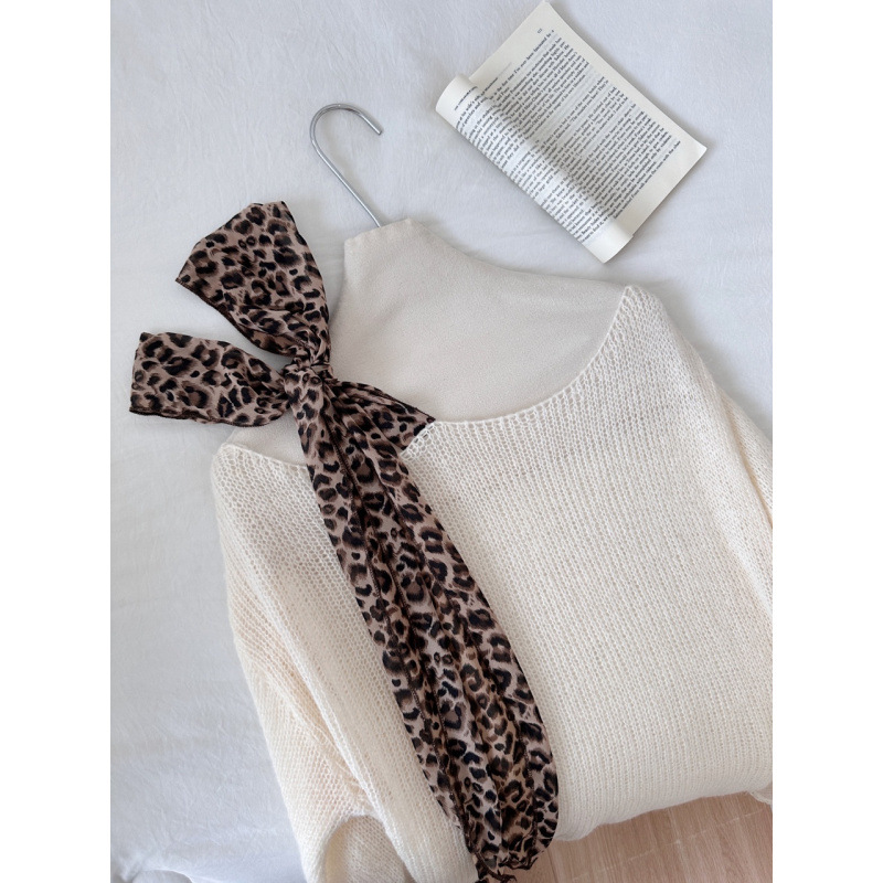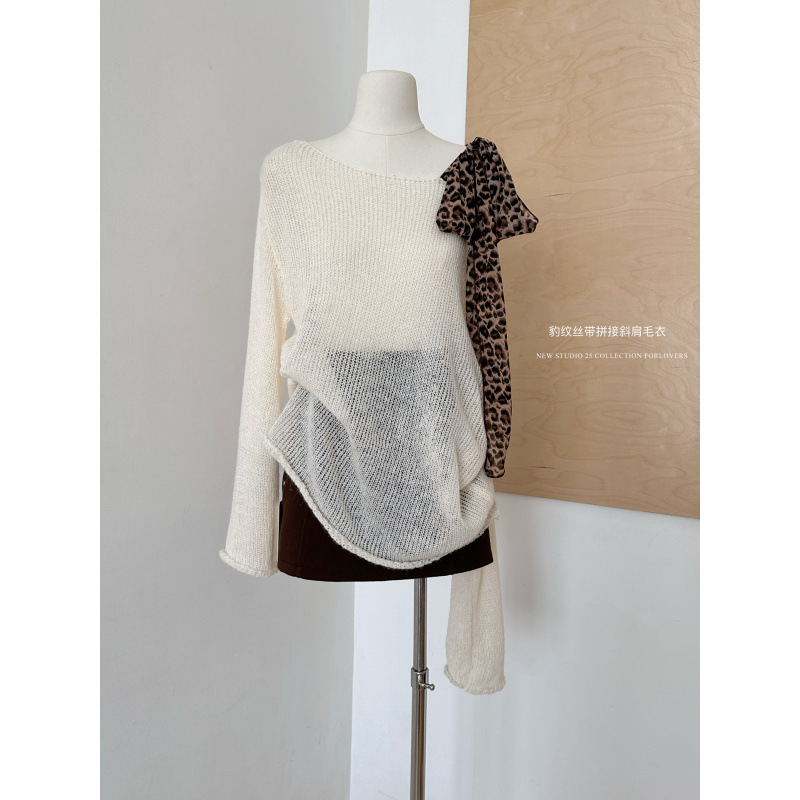 邱肉瑶 杏色豹纹丝带拼接针织衫女秋季新款休闲宽松气质斜肩毛衣