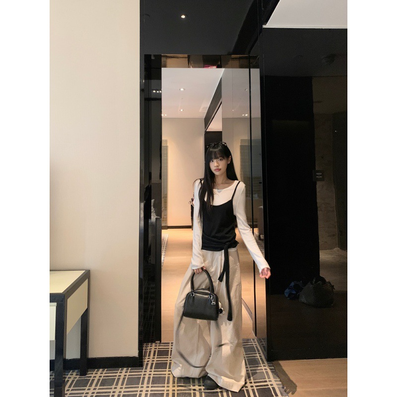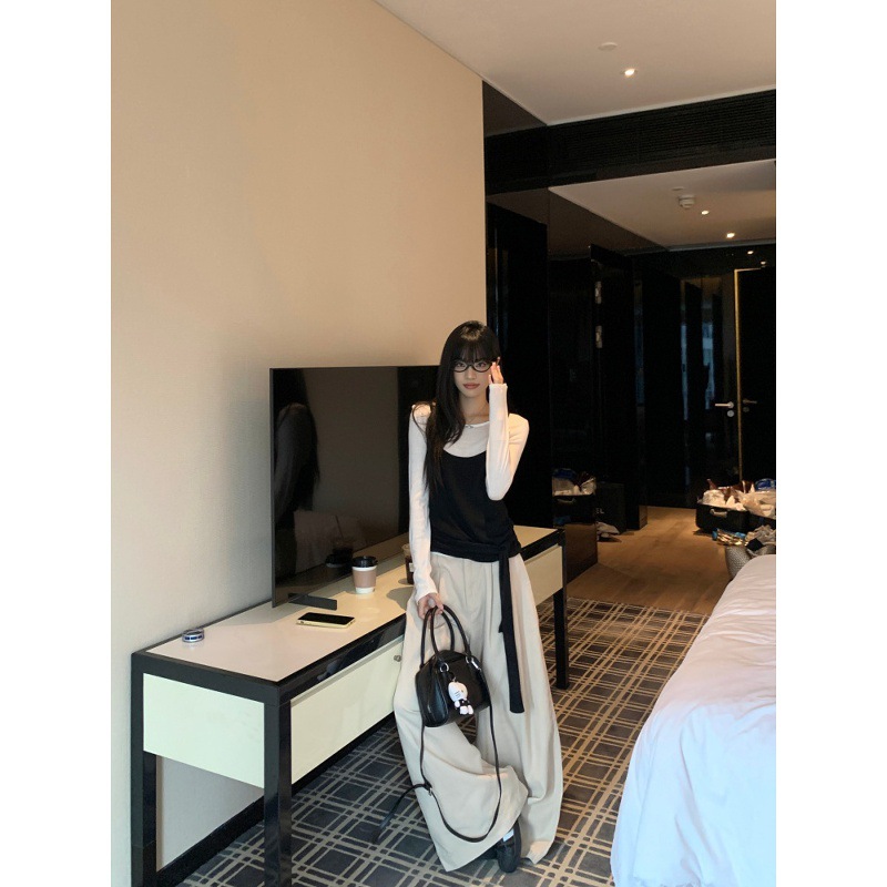 2025新款休闲套装撞色拼接长袖T恤女秋季高腰阔腿裤拖地裤两件套