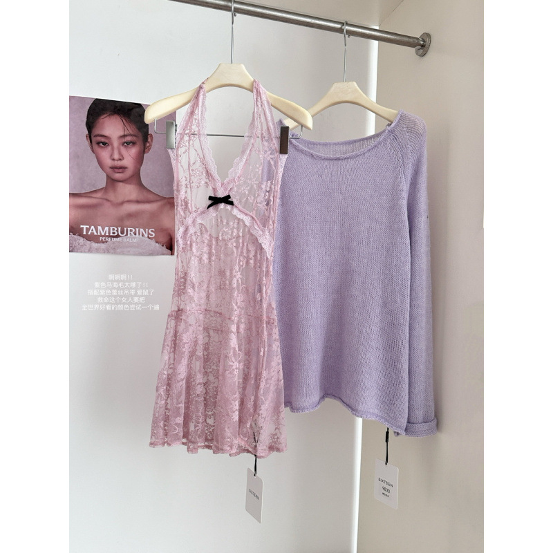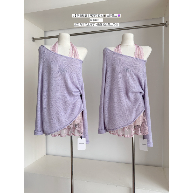 秋日私语毛衣女2025年秋宽松薄款针织上衣搭配挂脖蕾丝打底