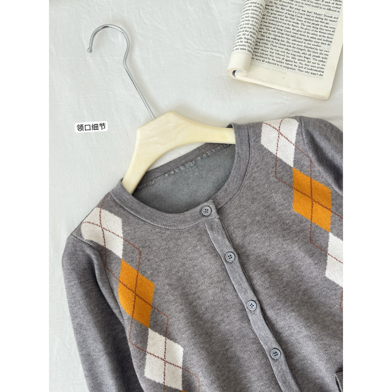 2025菱形格针织衫女秋季新款长袖复古慵懒风毛衣开衫上衣