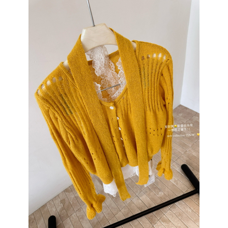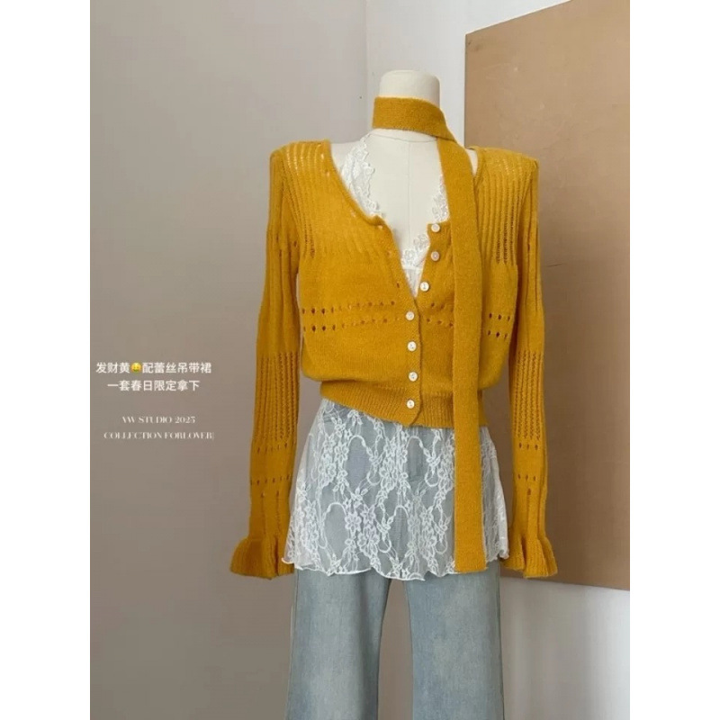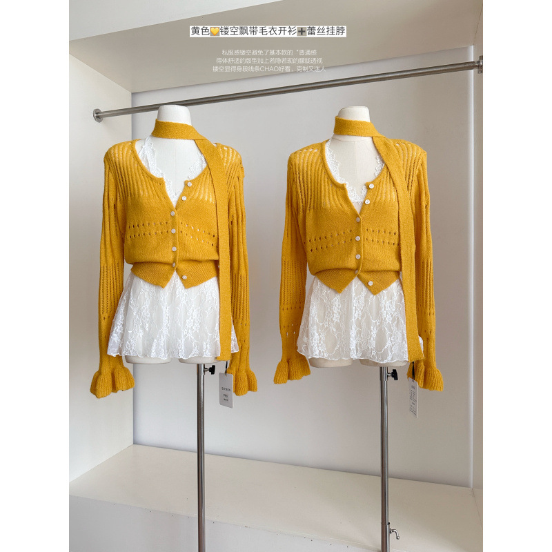 黄色气质法式镂空长袖针织开衫女设计感飘带毛衣配挂脖蕾丝两件套