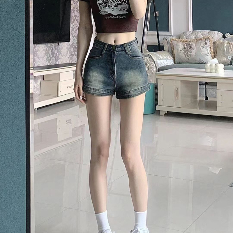 工厂批发美式复古做旧牛仔裤短裤女高腰弹力显瘦显腿长a字裤短裤