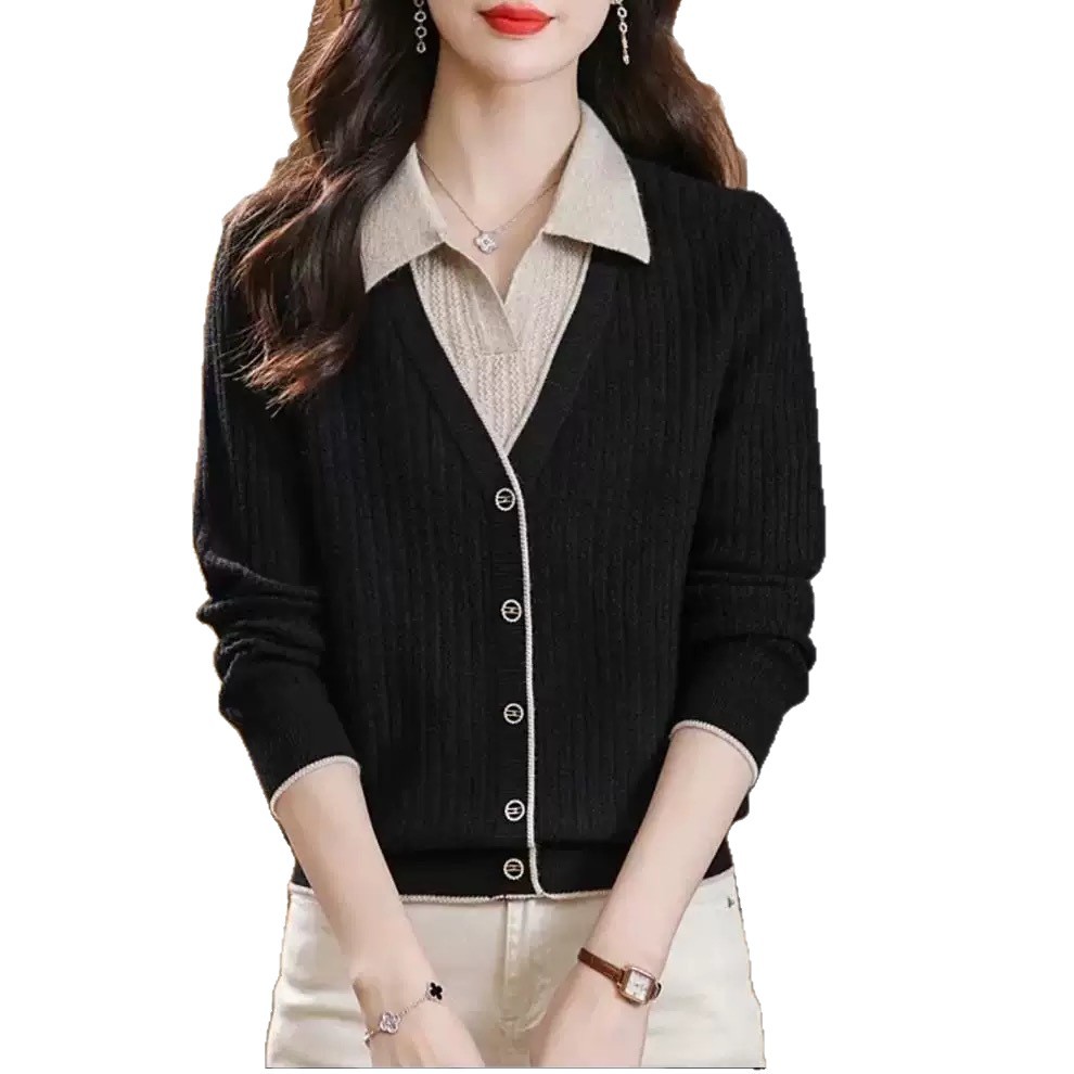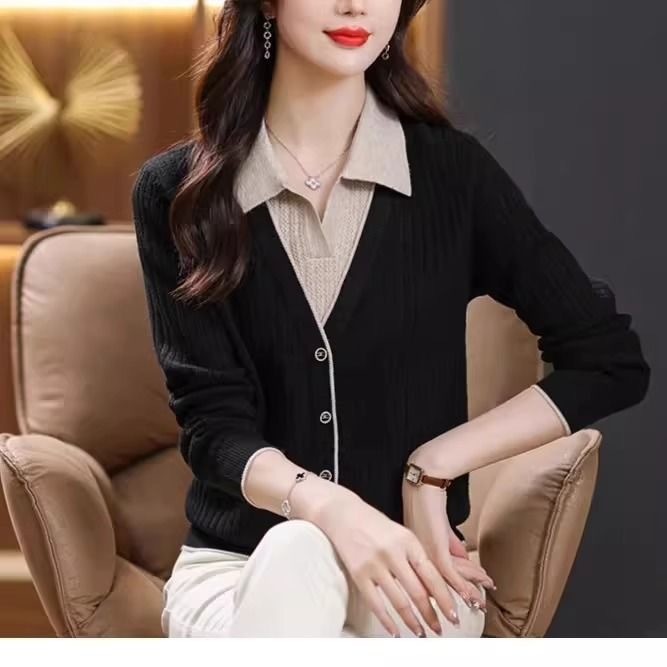 2025新款假两件翻领毛衣针织衫洋气宽松外穿打底衫百搭长袖上衣女
