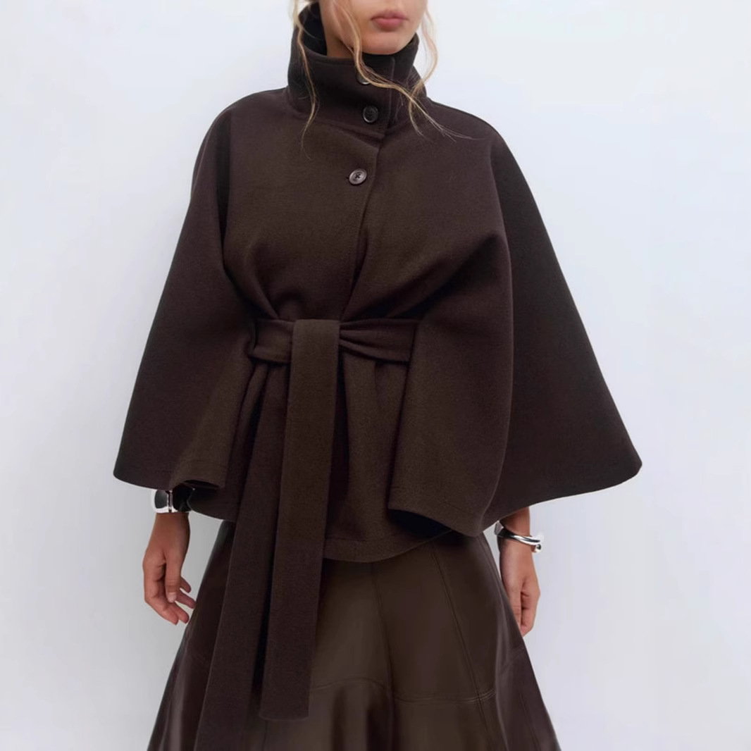 欧美女装秋冬季新款亚马逊跨境时尚纯色斗篷立领纽扣腰带毛呢外套