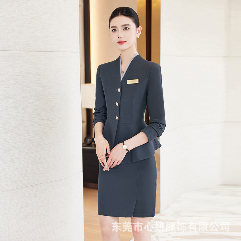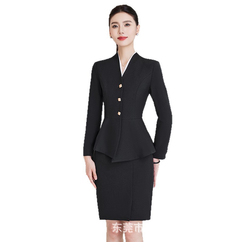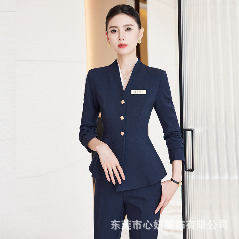 荷叶边修身遮肚子西装女秋冬美容院工作服高端酒店前台职业装套装