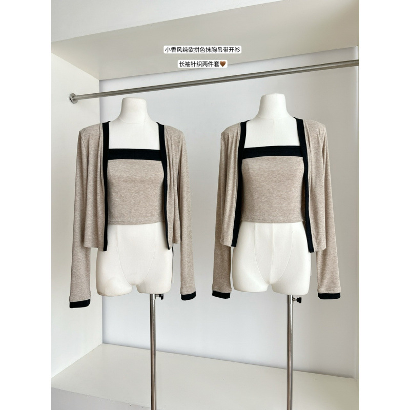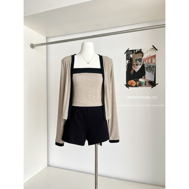 2025新燕麦撞色针织开衫外套女+防滑抹胸修身气质纯欲性感两件套