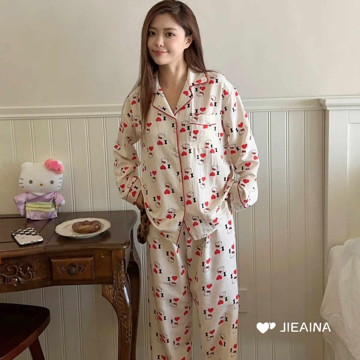 JIEAINA趣味卡通轻纱睡衣套装女春秋新款日系可爱格子米奇家居服