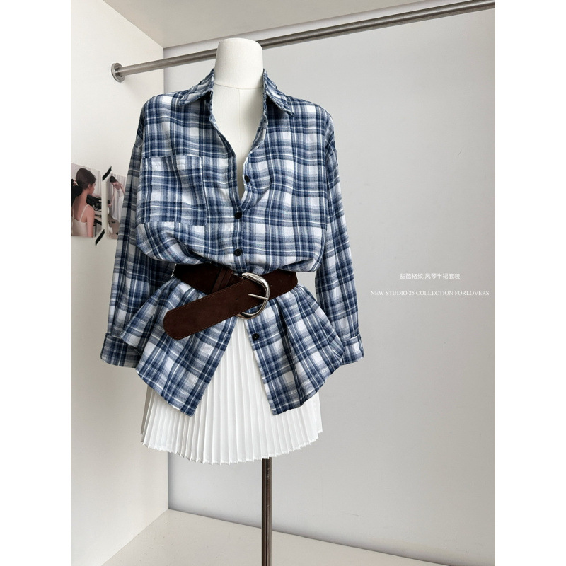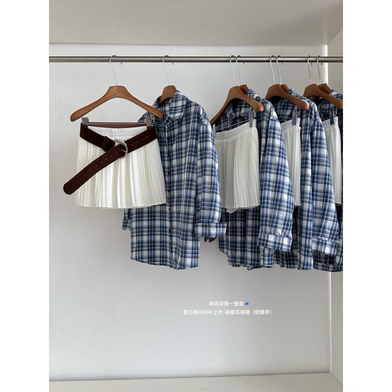 春夏出行穿搭复古格纹长袖衬衫上衣女高腰百褶半身裙皮带三件套装