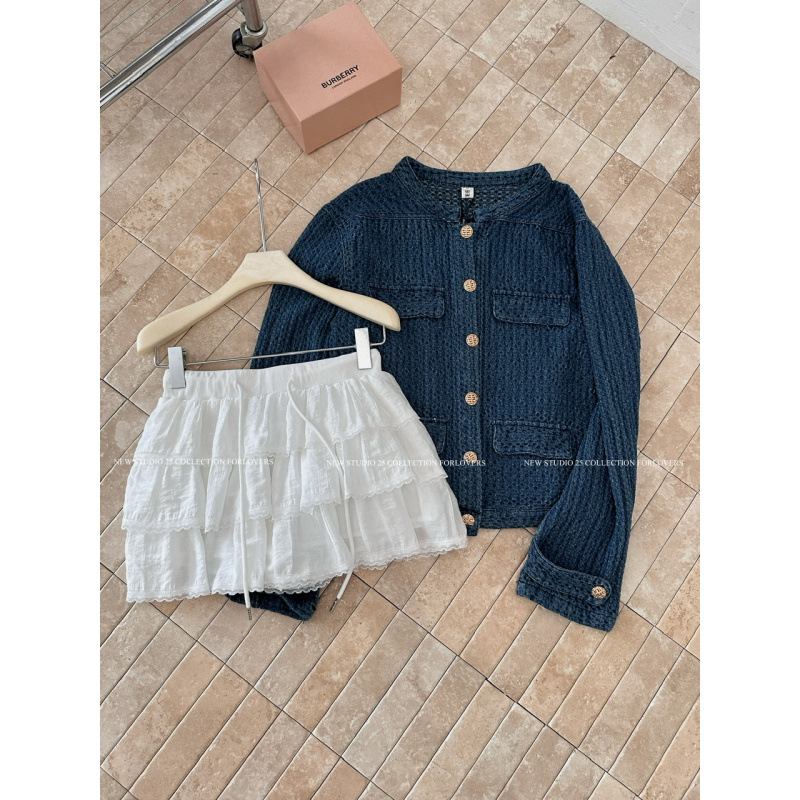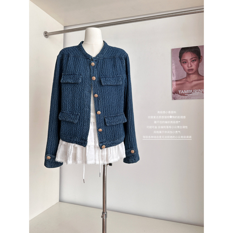 小众肌理感牛仔小香外套型立领夹克搭甜美蓬蓬白色半身裙两件套