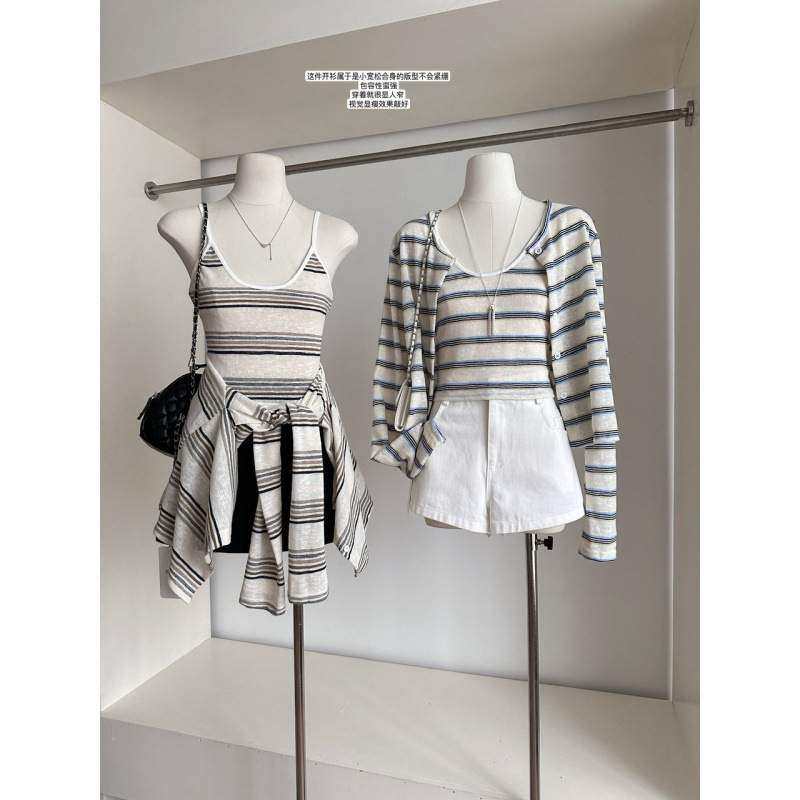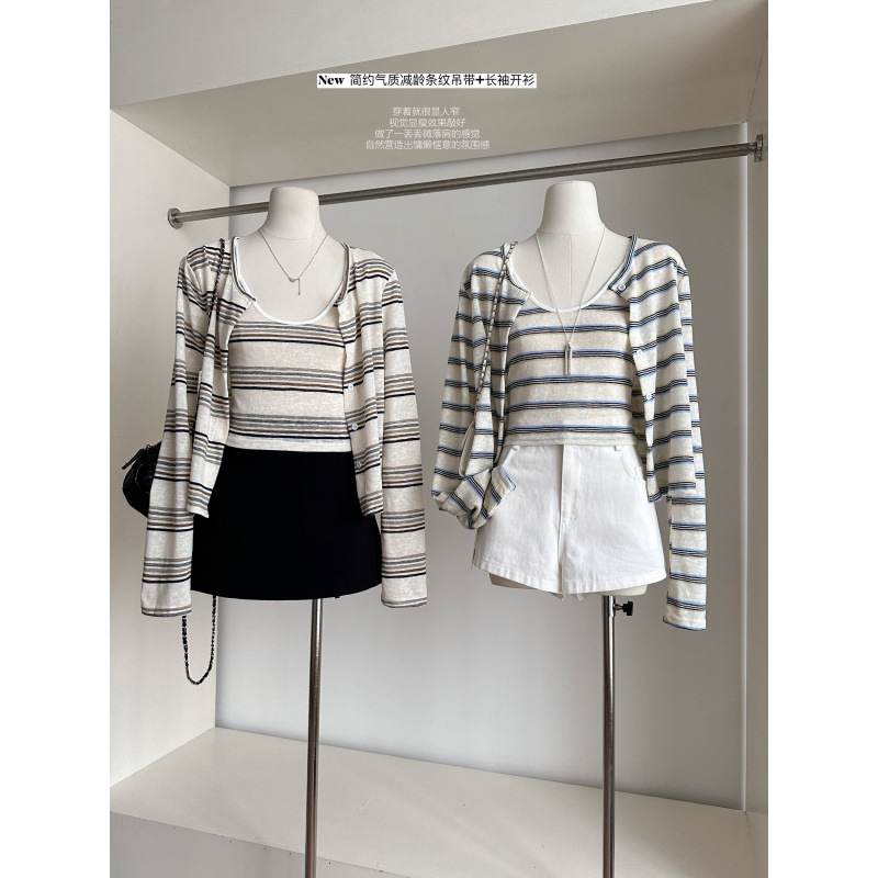 2025新款条纹针织内搭吊带背心秋季气质防晒薄款长袖开衫上衣套装