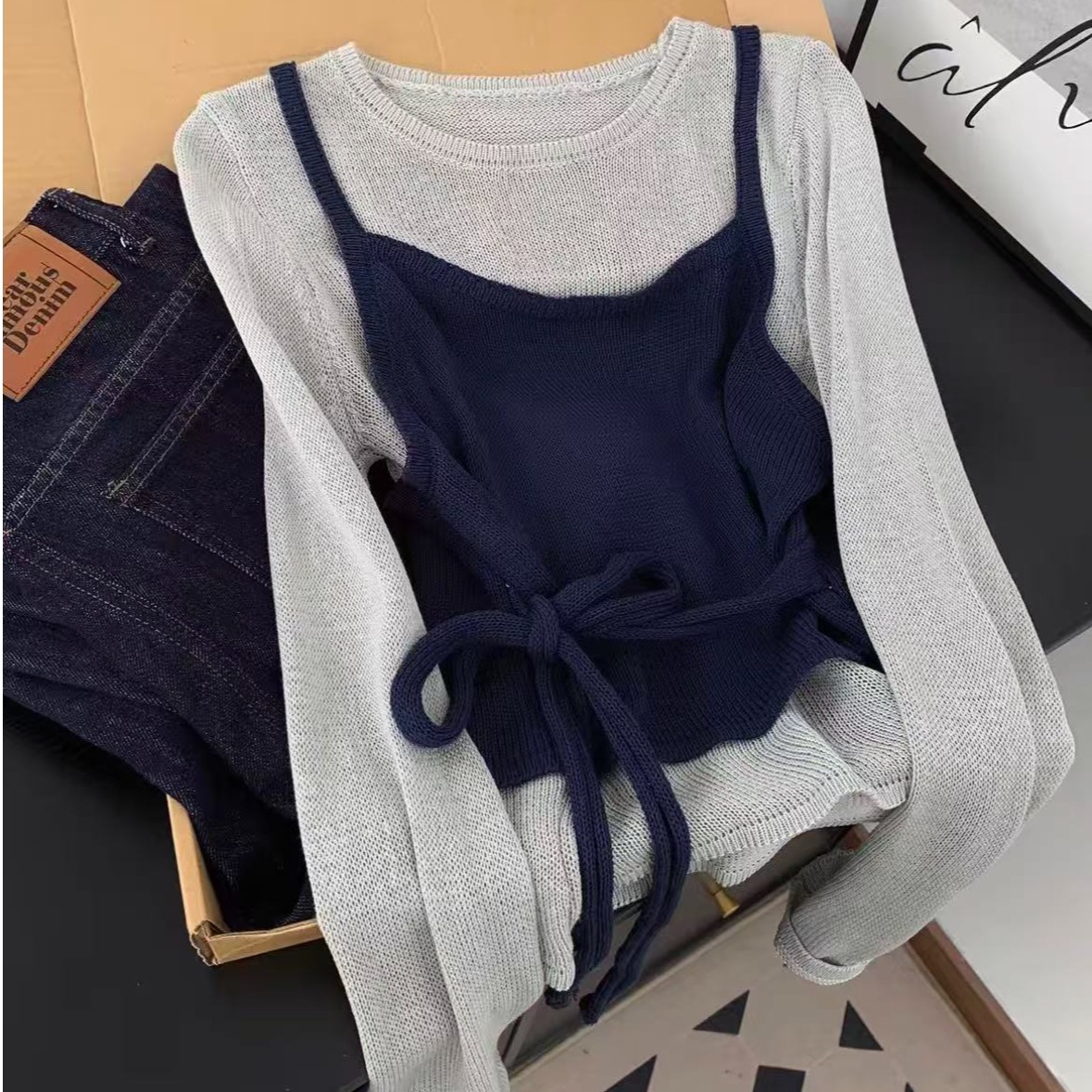 早秋松弛感两件拼接毛衣针织衫女时尚绑带收腰长袖针织上衣